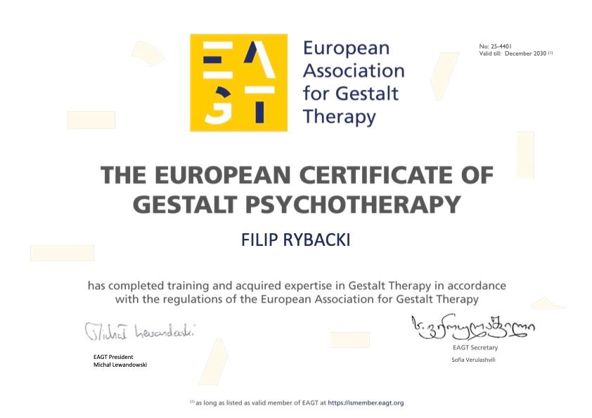 Instytut Integralnej Psychoterapii Gestalt (IIPG) w Krakowie – Mój fundament. Ukończyłem pełne, 4-letnie szkolenie zawodowe w ośrodku akredytowanym przez EAGT (European Association for Gestalt Therapy). To 1850 godzin nauki, staży klinicznych oraz mojej własnej psychoterapii. Dzięki temu wiem, jak towarzyszyć Ci w procesie zmian w sposób odpowiedzialny i uważny.