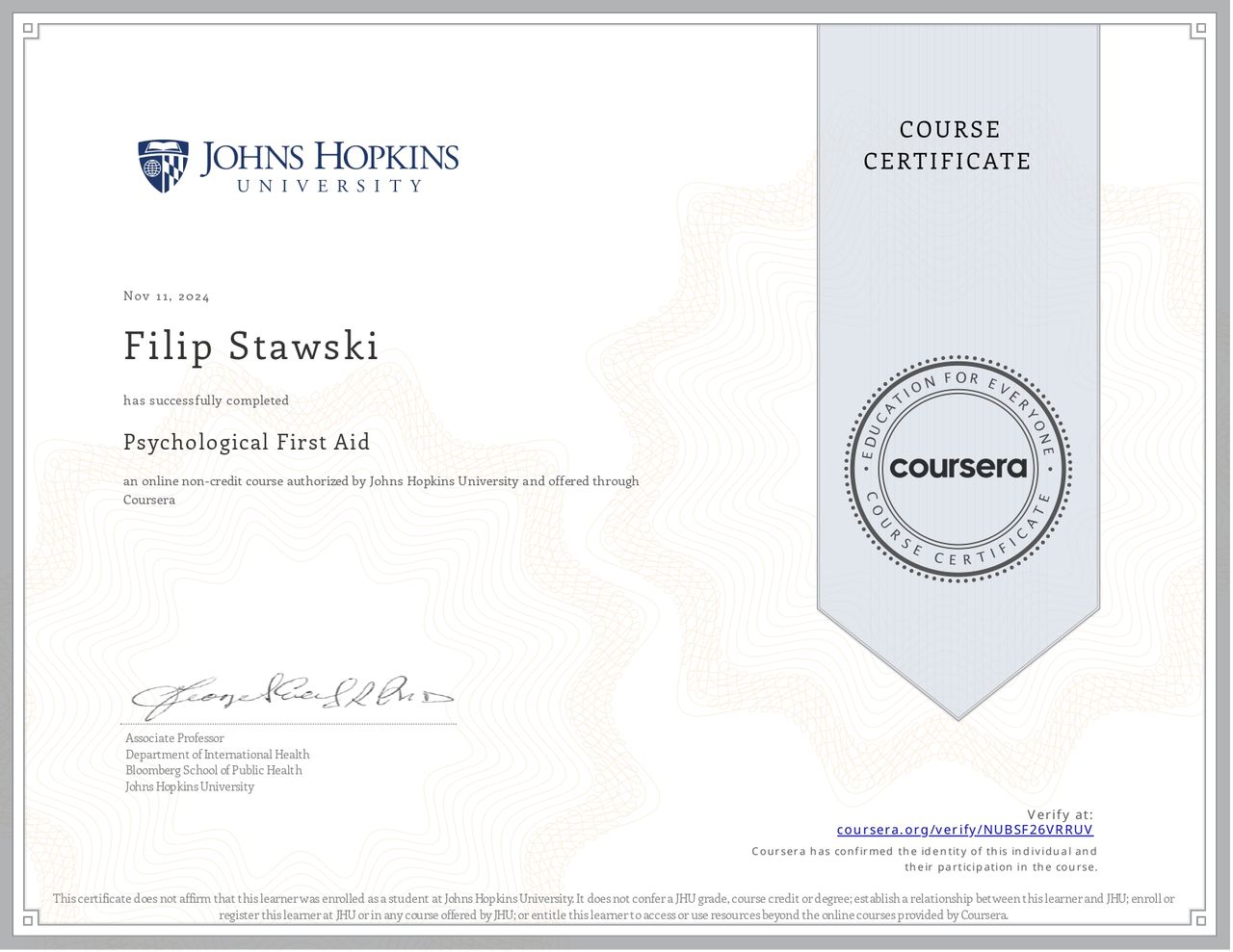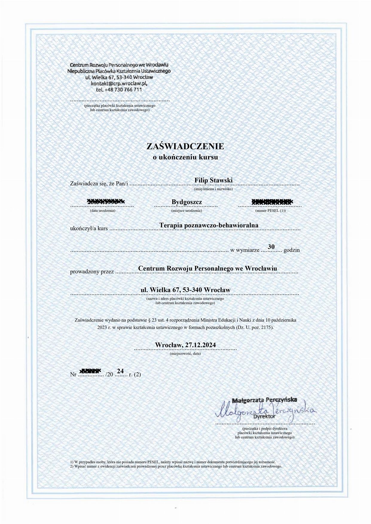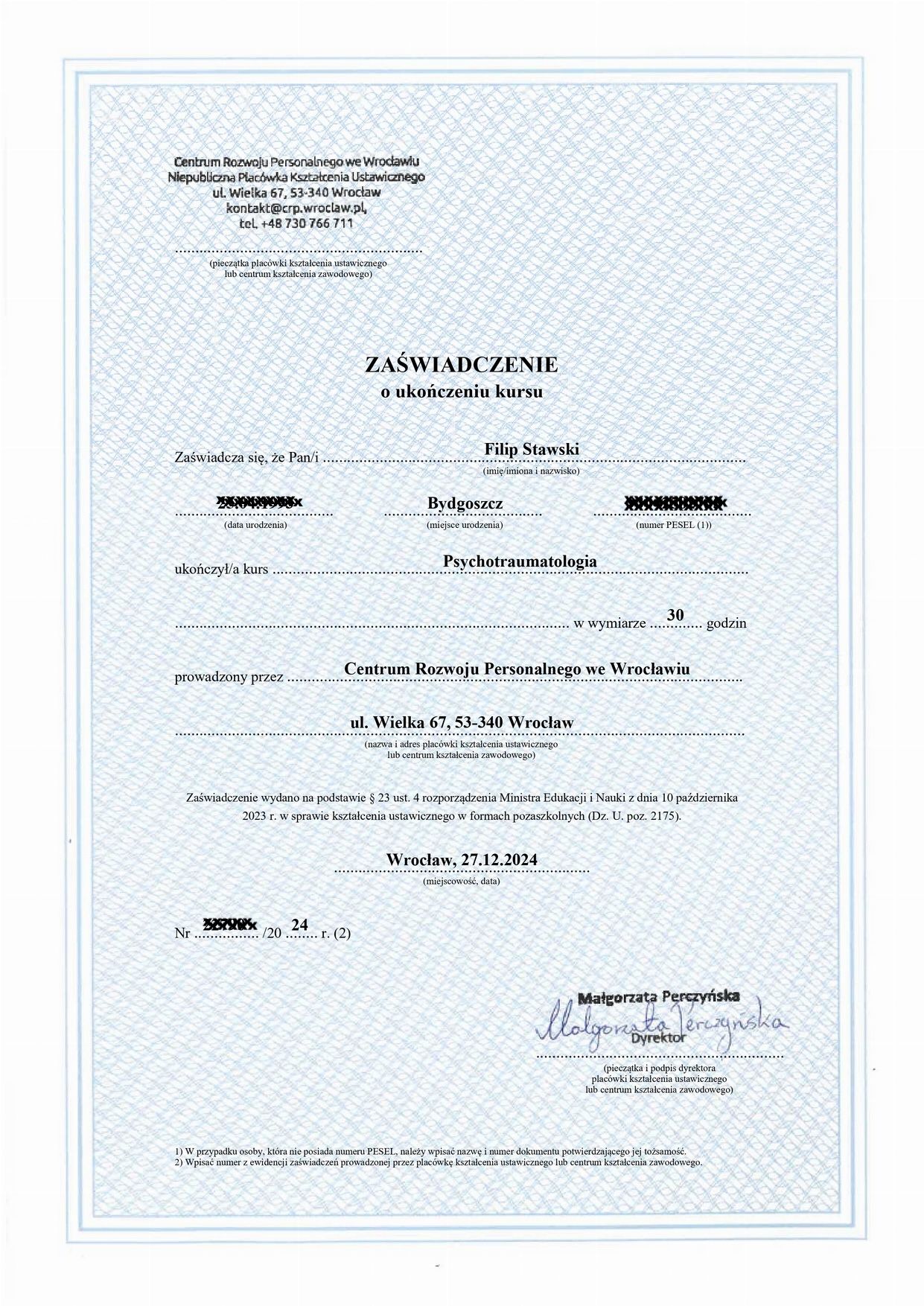 Realizuje regularnie kursy dokształcające (m.in.: z zakresu psychotraumatologii, prewencji samobójstw i podstawowej oceny neuropsychologicznej) oraz uczestniczę jako prelegent w konferencjach naukowych w Polsce i za granicą.