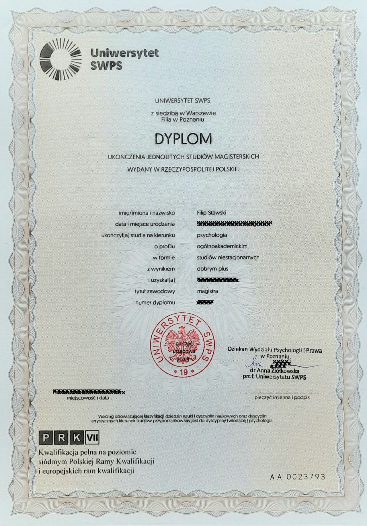 Jestem absolwentem psychologii (st. magisterskie spec. psychologia kliniczna) na Uniwersytecie SWPS oraz filozofii na UKW (st. magisterskie) i UAM (doktorat z zakresu neurobiologicznego podłoża procesów poznawczych). Pracuję naukowo na Uniwersytecie Kazimierza Wielkiego w Bydgoszczy, gdzie prowadzę zajęcia dla studentów kognitywistyki, filozofii oraz psychologii.