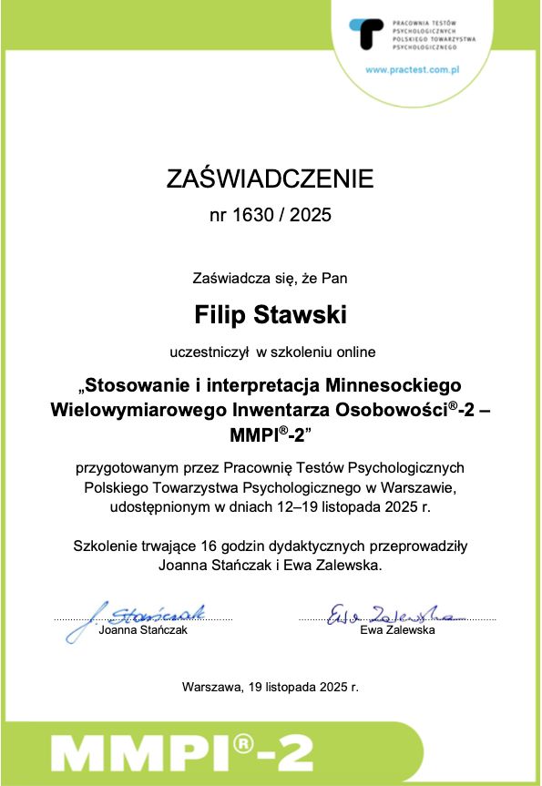 Jaki jest zakres porad oferowanych przez Filip Stawski?Filip Stawski to psycholog. Na podstawie swojego doświadczenia i wykształcenia Filip Stawski oferuje usługi takie jak: testy psychologiczne, Terapia psychologiczna, Konsultacja psychologiczna, Badanie funkcji poznawczych, poradnictwo psychologiczne, konsultacja psychologiczna (osoby nastoletnie), Diagnoza psychologiczna, Diagnoza zaburzeń osobowości - SCID-5-PD, diagnoza ADHD dla dorosłych, Konsultacja psychologiczna online.