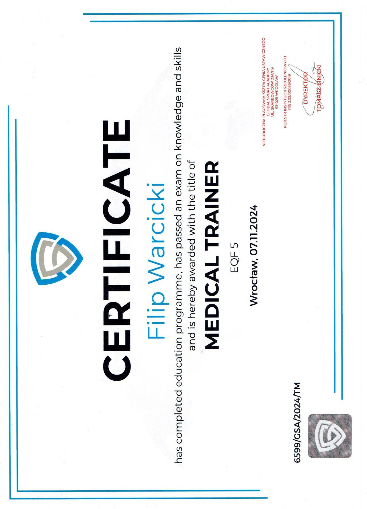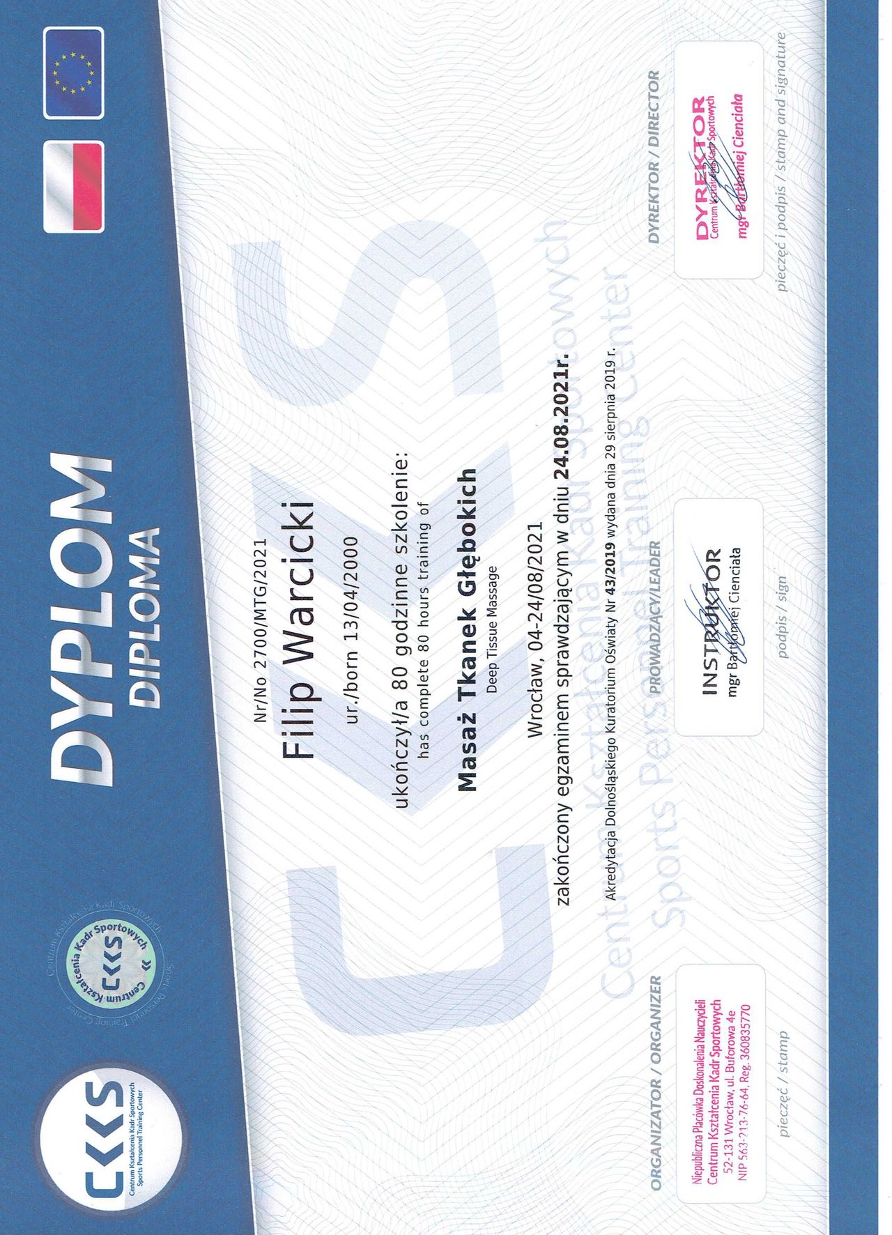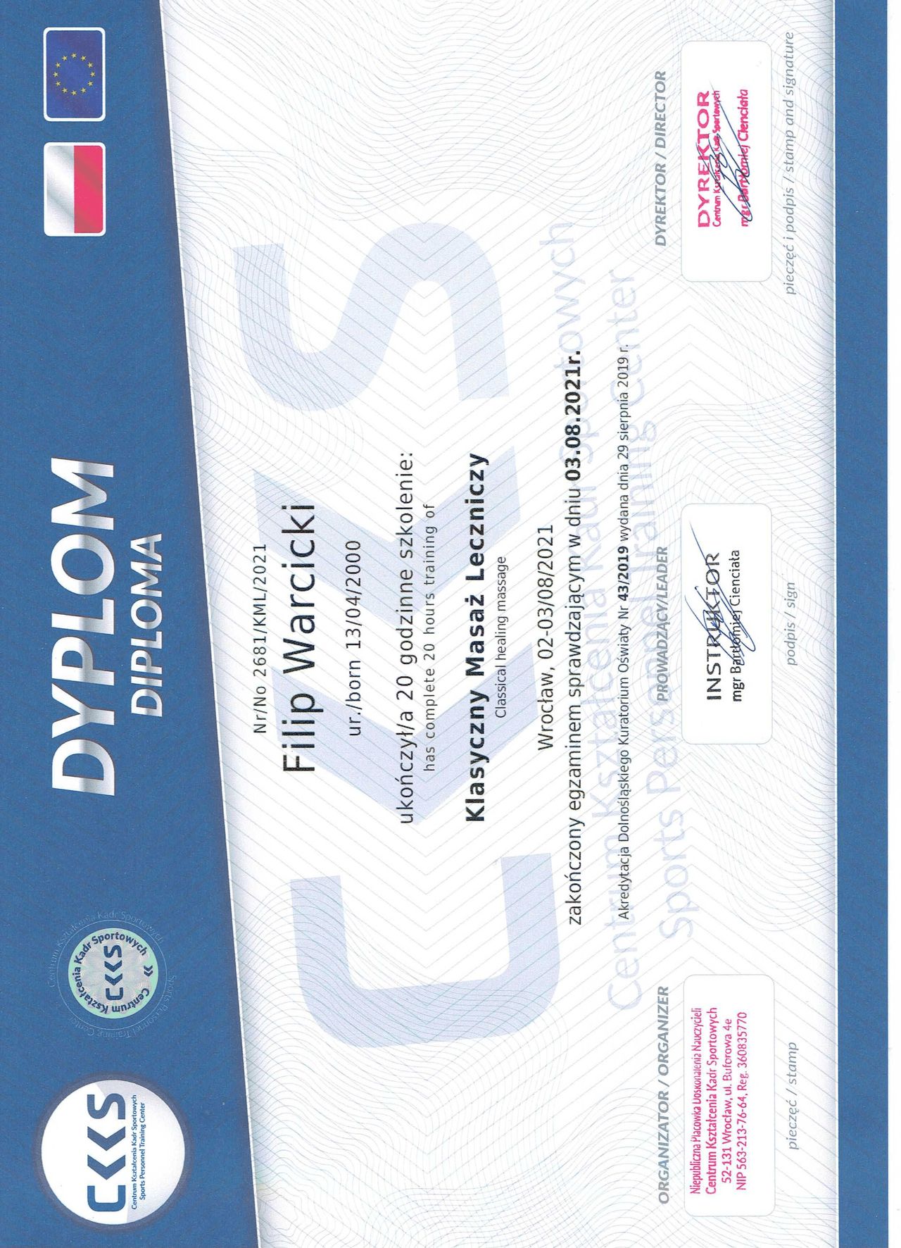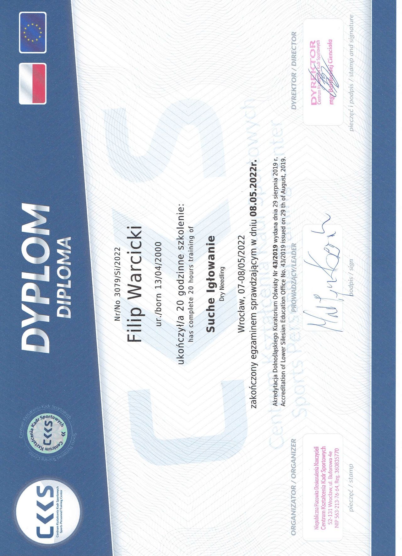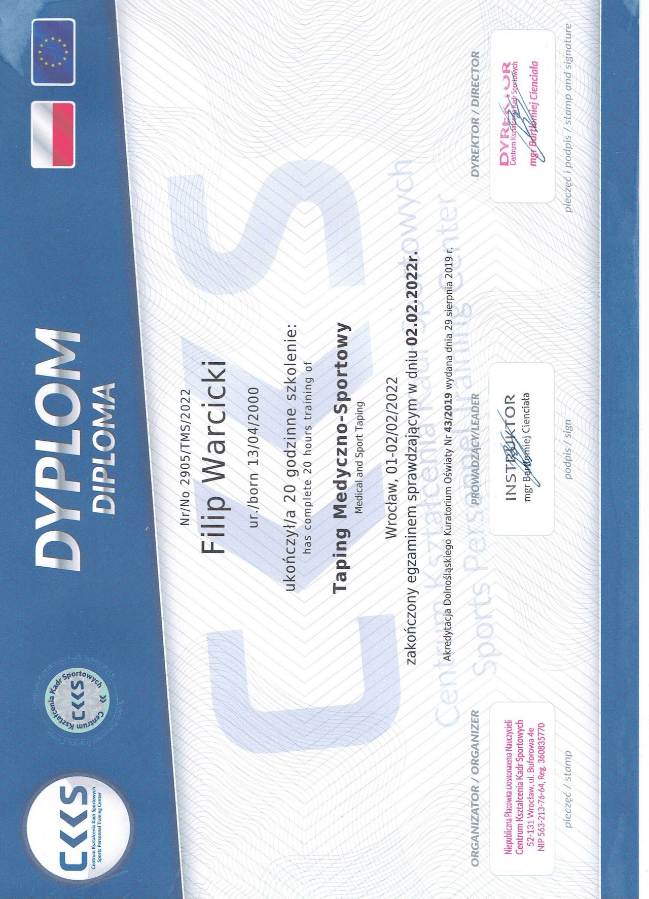 Dodatkowo ukończyłem obszerny kurs z terapii manualnej pod okiem osteopaty, kurs suchego igłowania, kilka kursów masażu (między innymi masaż tkanek głębokich), taping medyczno-sportowy oraz kurs trenera medycznego.