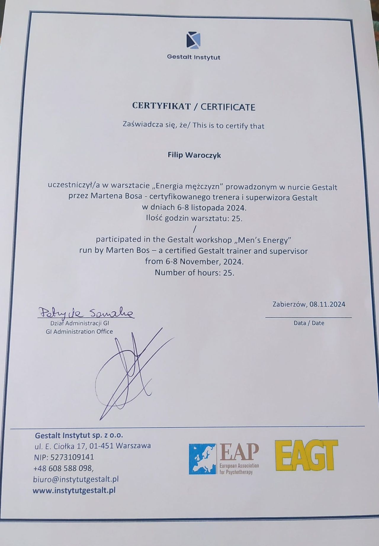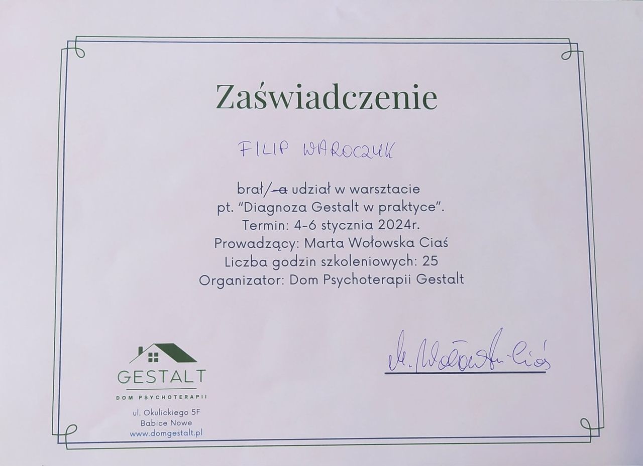 Jaki jest zakres porad oferowanych przez Filip Waroczyk?Filip Waroczyk to psycholog, psychoterapeuta. Na podstawie swojego doświadczenia i wykształcenia Filip Waroczyk oferuje usługi takie jak: Interwencja w kryzysie, Konsultacja psychologiczna, Psychoterapia, psychoterapia indywidualna, psychoterapia Gestalt, konsultacja psychoterapeutyczna, psychoterapia młodzieży, psychoterapia dorosłych, konsultacja psychologiczna młodzieży, Konsultacja psychologiczna dla rodziców.