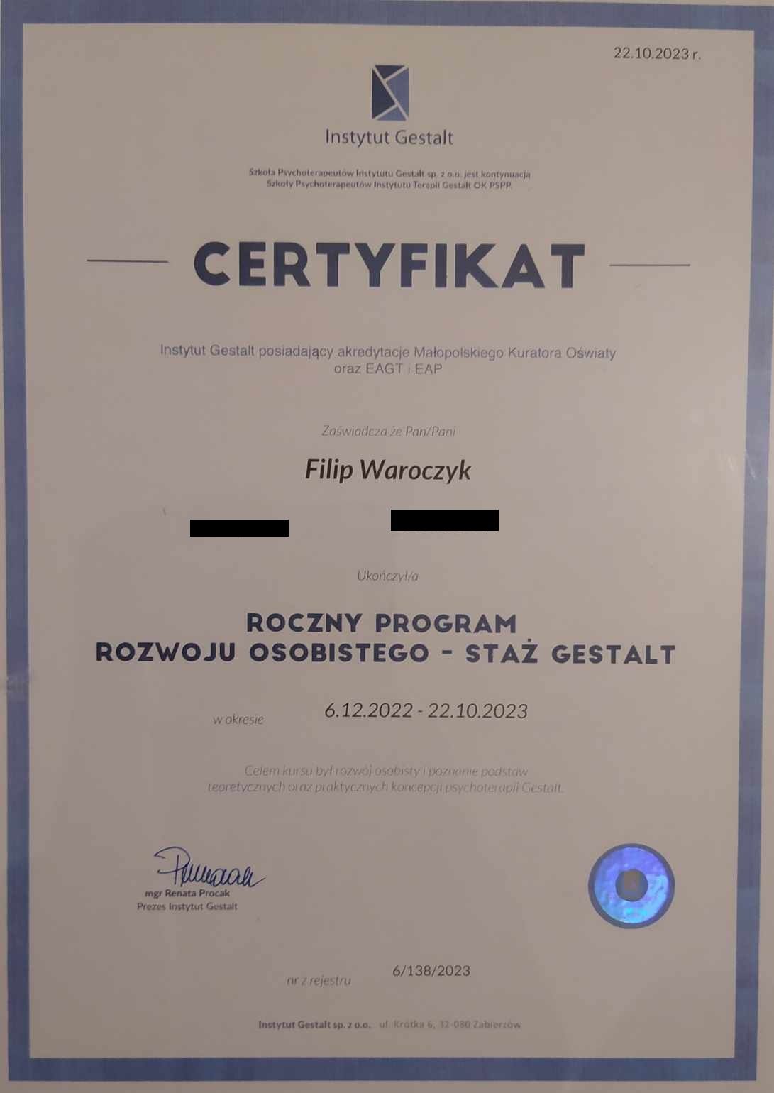 Doświadczyłem także swojej własnej psychoterapii indywidualnej, co pomaga mi lepiej wyobrażać sobie perspektywę osoby przychodzącej do mnie po wsparcie.