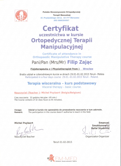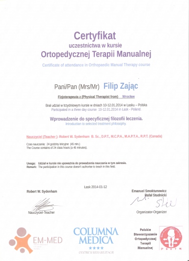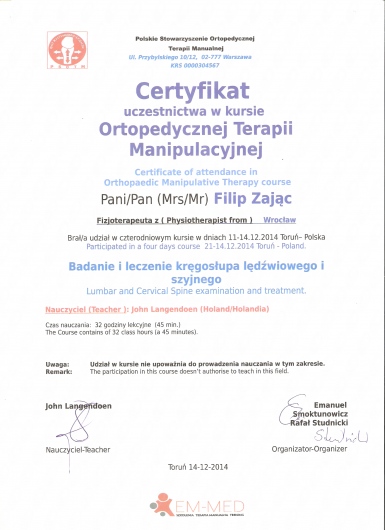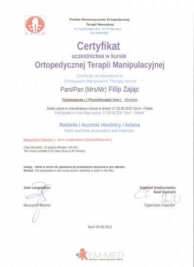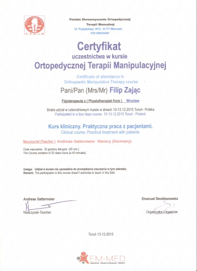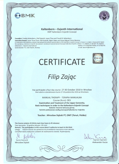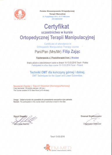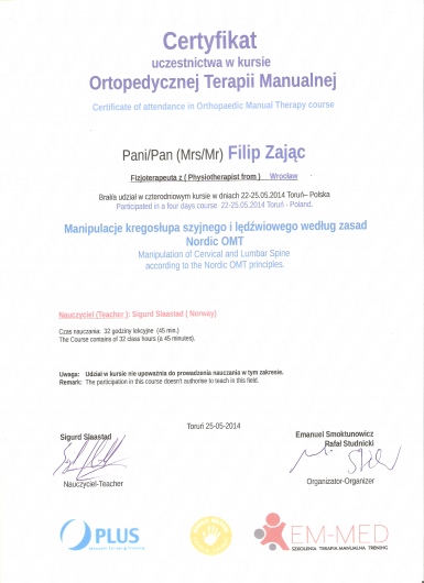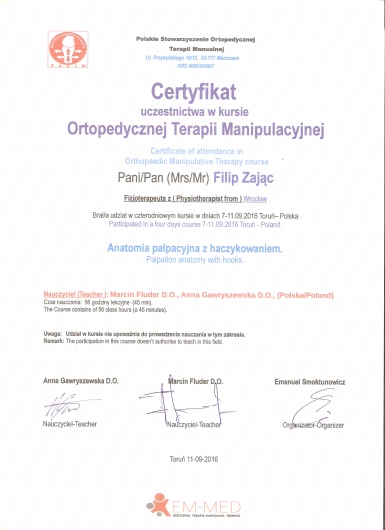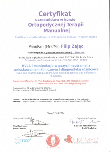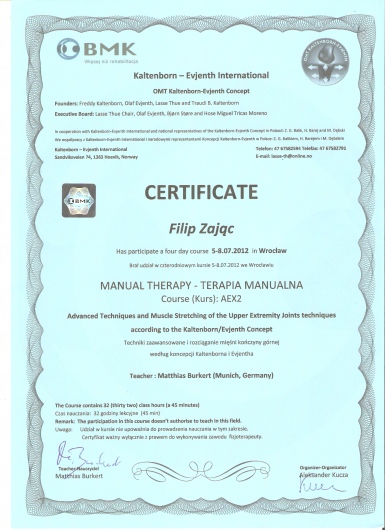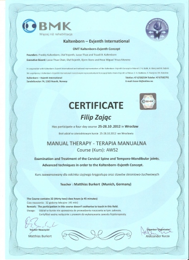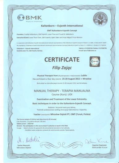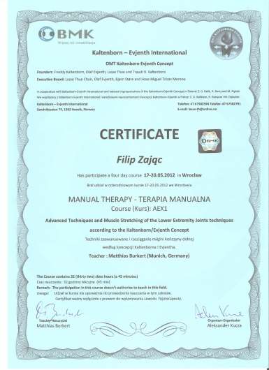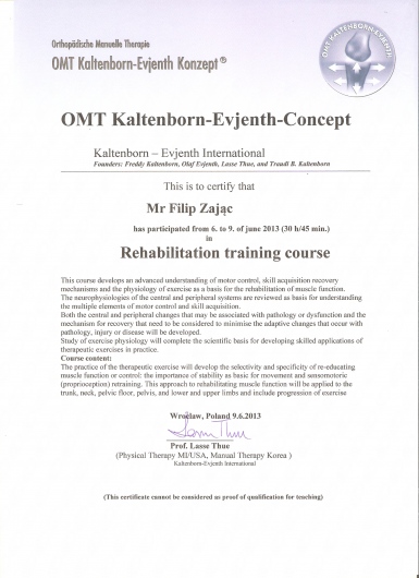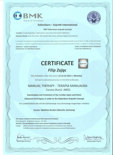 W roku 2018 uzyskałem tytuł OMPT według standardów IFOMPT, co jest obecnie najwyższym możliwym sprawdzeniem umiejętności terapeutycznych w Polsce.