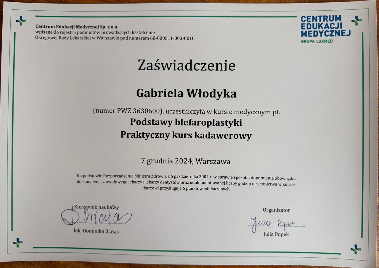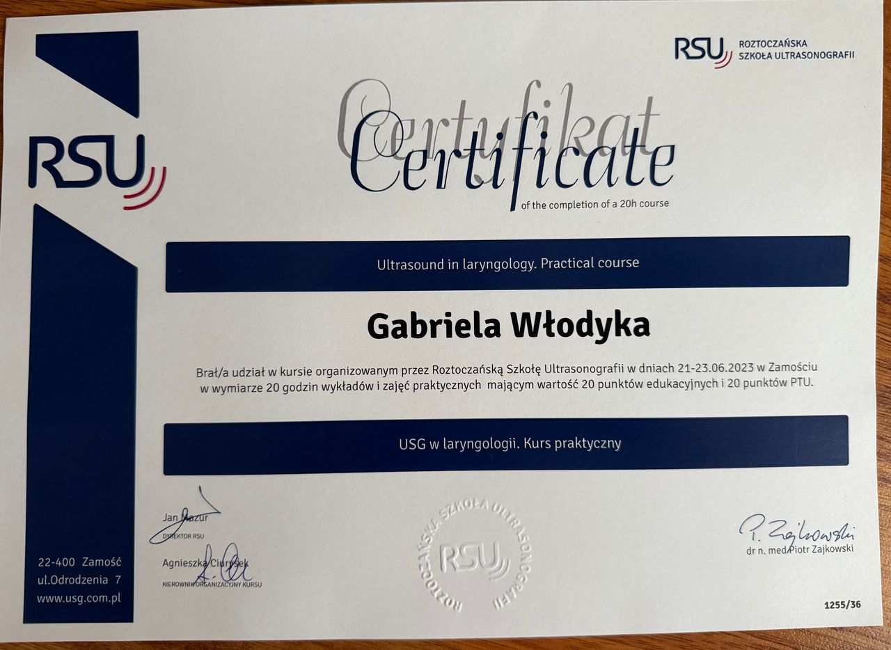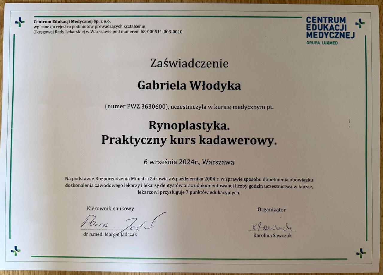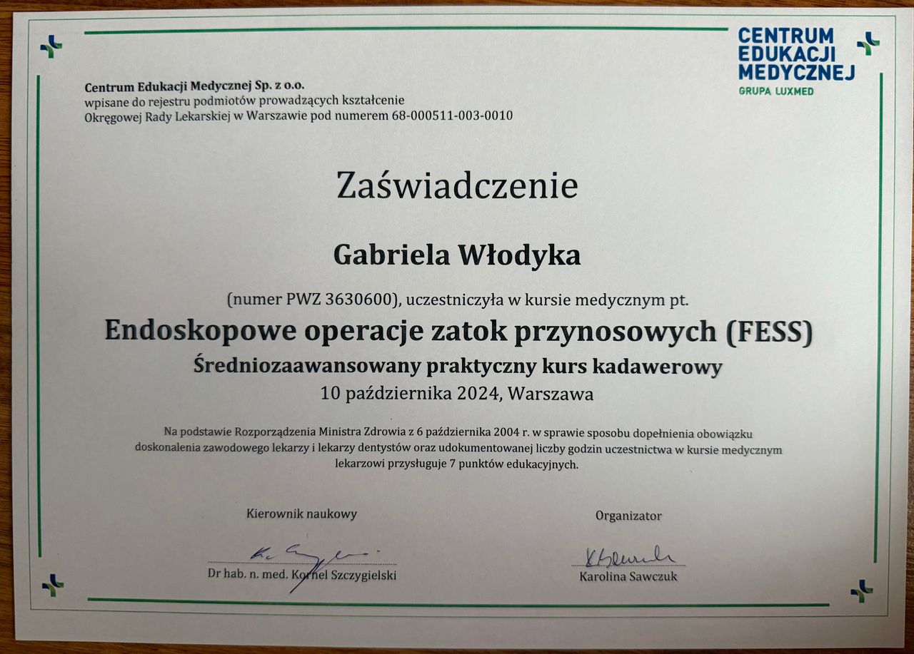 Jestem absolwentką Wydziału Lekarskiego Uniwersytetu Medycznego w Lublinie. Aktualnie jestem lekarzem w trakcie specjalizacji z otorynolaryngologii. Swoje szkolenie specjalizacyjne rozpoczęłam w Szpitalu Specjalistycznym w Sanoku. Obecnie szkolenie kontynuuję w Miejskim Szpitalu Specjalistycznym im. Gabriela Narutowicza w Krakowie. Stale poszerzam swoją wiedzę biorąc udział w licznych kongresach i szkoleniach.