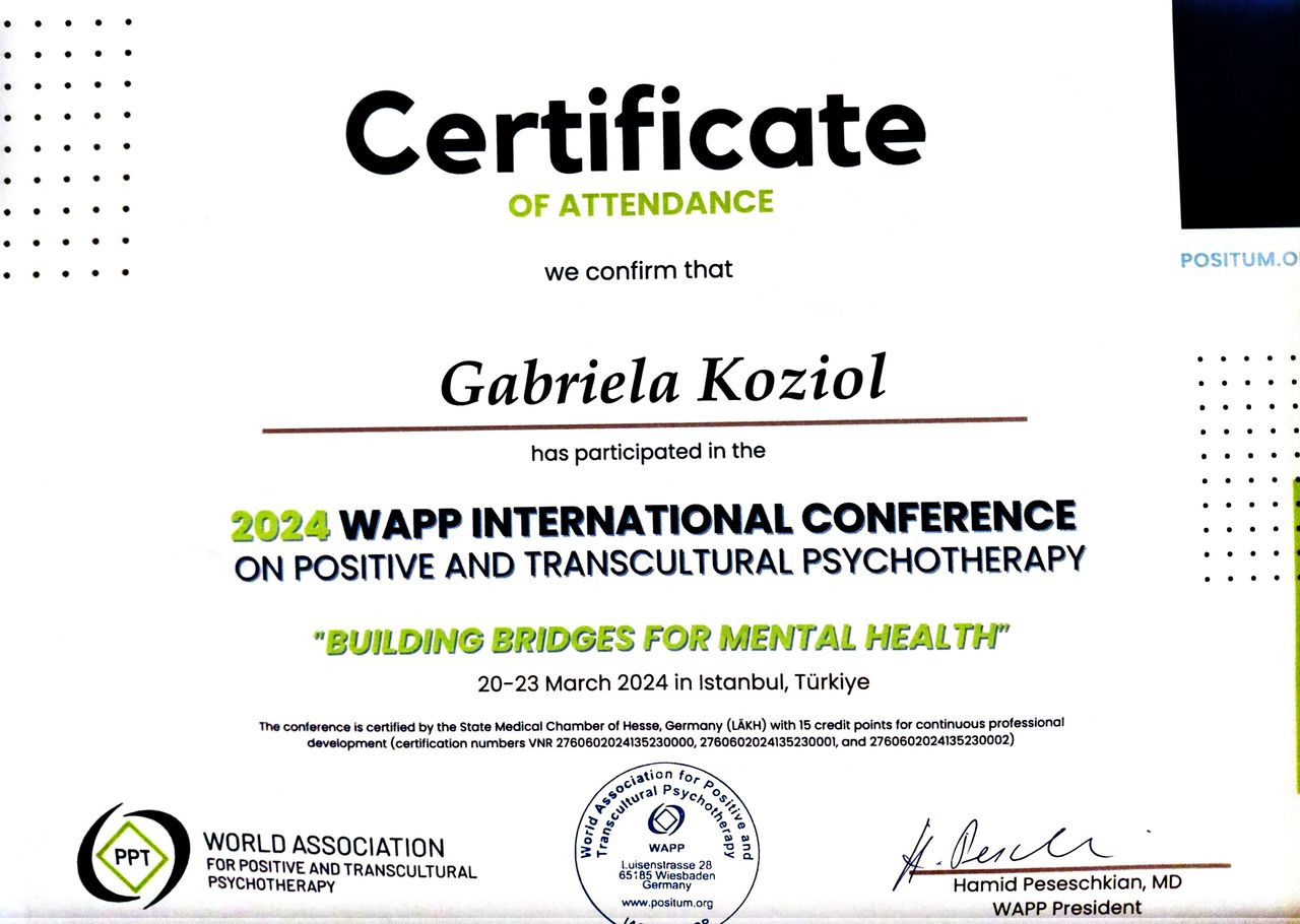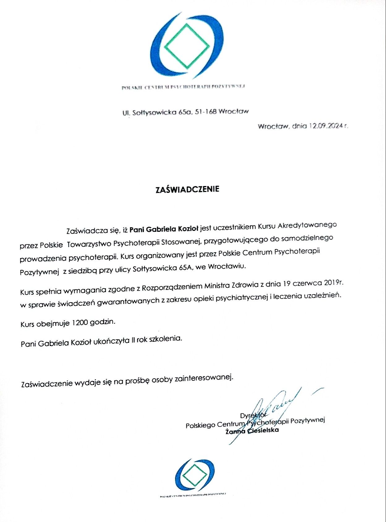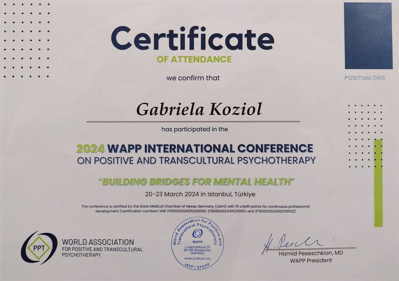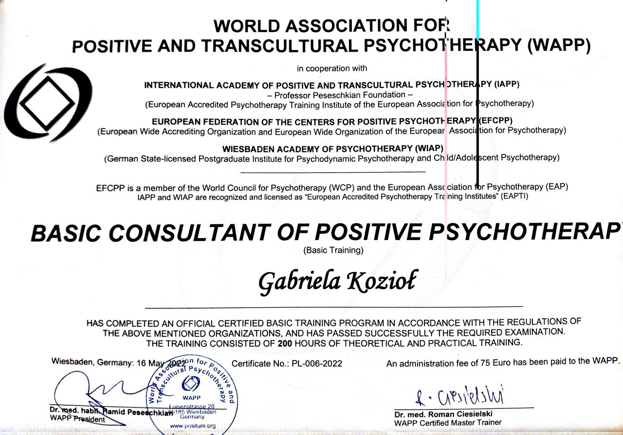 Jestem psychoterapeutką w trakcie 4 roku akredytowanego szkolenia w nurcie integracyjnym - Psychoterapii Pozytywnej Transkulturowej, która pomimo, że jest dość młodą modalnością zdobywa coraz większą popularność na świecie i w Polsce. PPT jest oparta na mocnych fundamentach badań, które potwierdzają jej medyczną skuteczność (zweryfikowaną w praktyce klinicznej i terapeutycznej). Integruje ona w sobie m.in. psychoterapię humanistyczną oraz psychodynamiczną (sprawdzone i uznane w swojej skuteczności nurty), a jednocześnie odwołuje się do transkulturowej wizji człowieka. Psychoterapia Pozytywna jest uznaną metoda leczenia, jest akredytowana przez Europejskie Stowarzyszenie Psychoterapii, Światową Radę Psychoterapii i Międzynarodową Federację Psychoterapii. W Polsce funkcjonuje Polskie Centrum Transkulturowej Psychoterapii Pozytywnej przy współpracy z Akademią Psychoterapii w Wiesbaden (Niemcy), pod patronatem Światowego Stowarzyszenia Psychoterapii Pozytywnej.