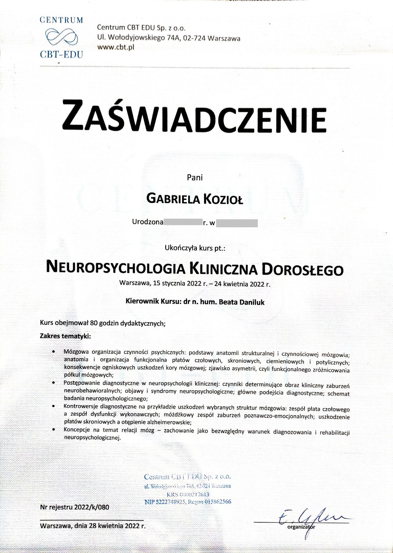 W ramach ciągłego rozwoju osobistego oraz ustawicznego podnoszenia swoich kwalifikacji zawodowych ukończyłam również szereg specjalistycznych kursów i szkoleń.