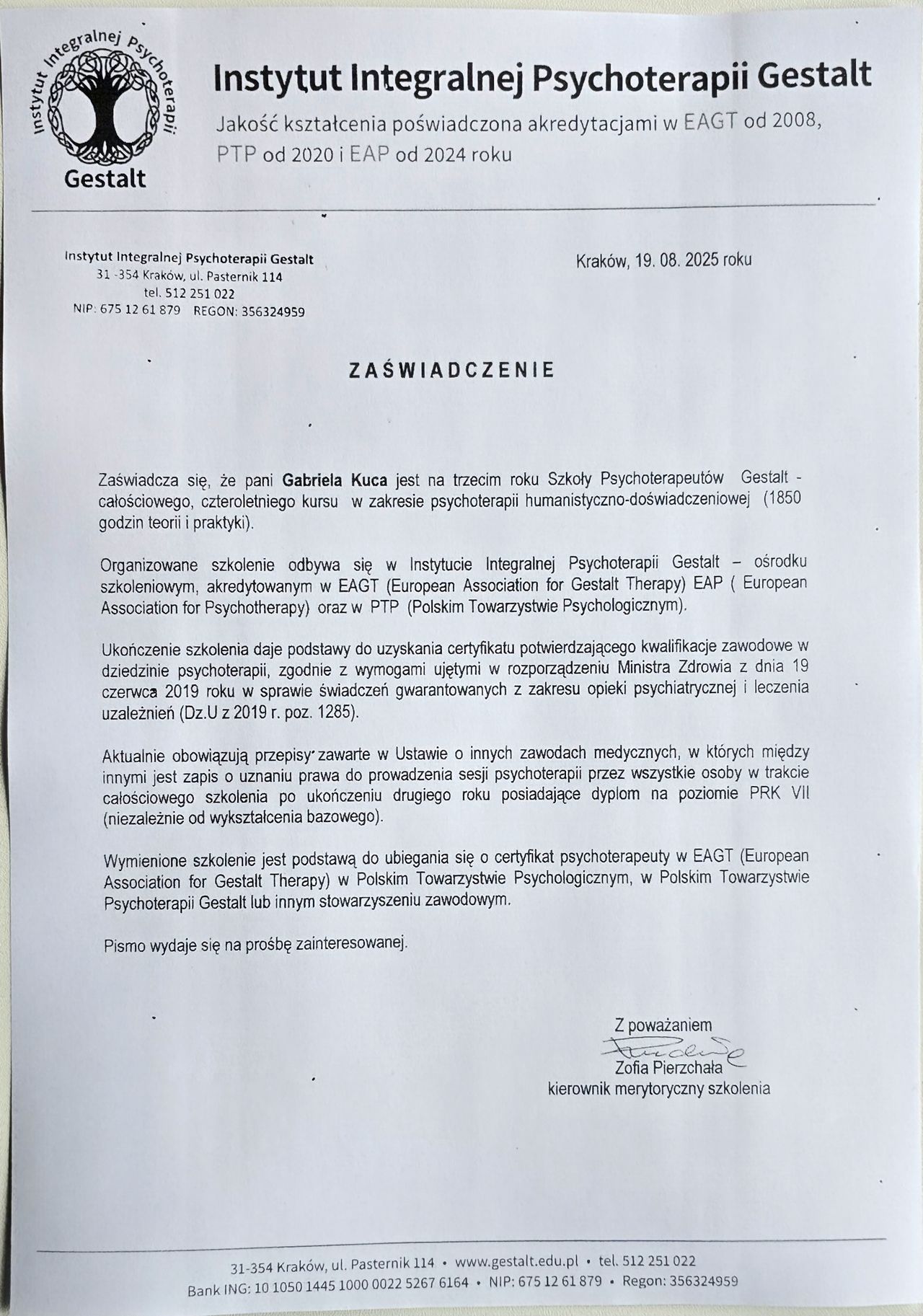 Uczestniczę w 4-letnim stacjonarnym szkoleniu (1850 godzin teorii i praktyki) z zakresu psychoterapii humanistyczno – doświadczeniowej Gestalt w Krakowie (4-ty rok). Odbywa się ono w ośrodku szkoleniowym akredytowanym w EAGT (European Association for Gestalt Therapy), EAP (European Association for Psychotherapy) oraz w PTP (Polskim Towarzystwie Psychologicznym).