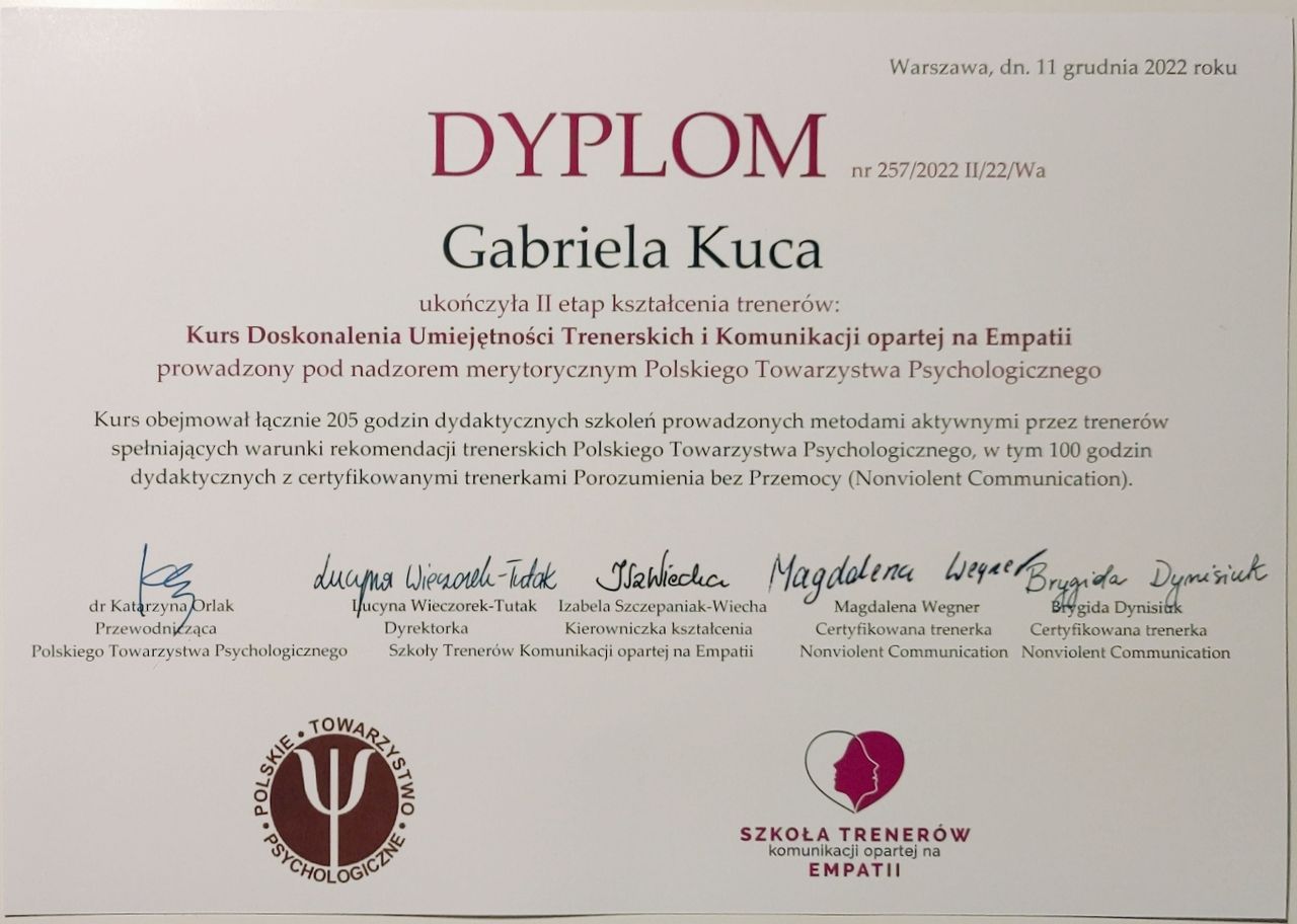 Posiadam dyplom 2-letniej Szkoły Trenerów i Trenerek Komunikacji opartej na Empatii inspirowanej Porozumieniem bez Przemocy, czyli metodzie opracowanej przez Marshalla Rosenberga.
