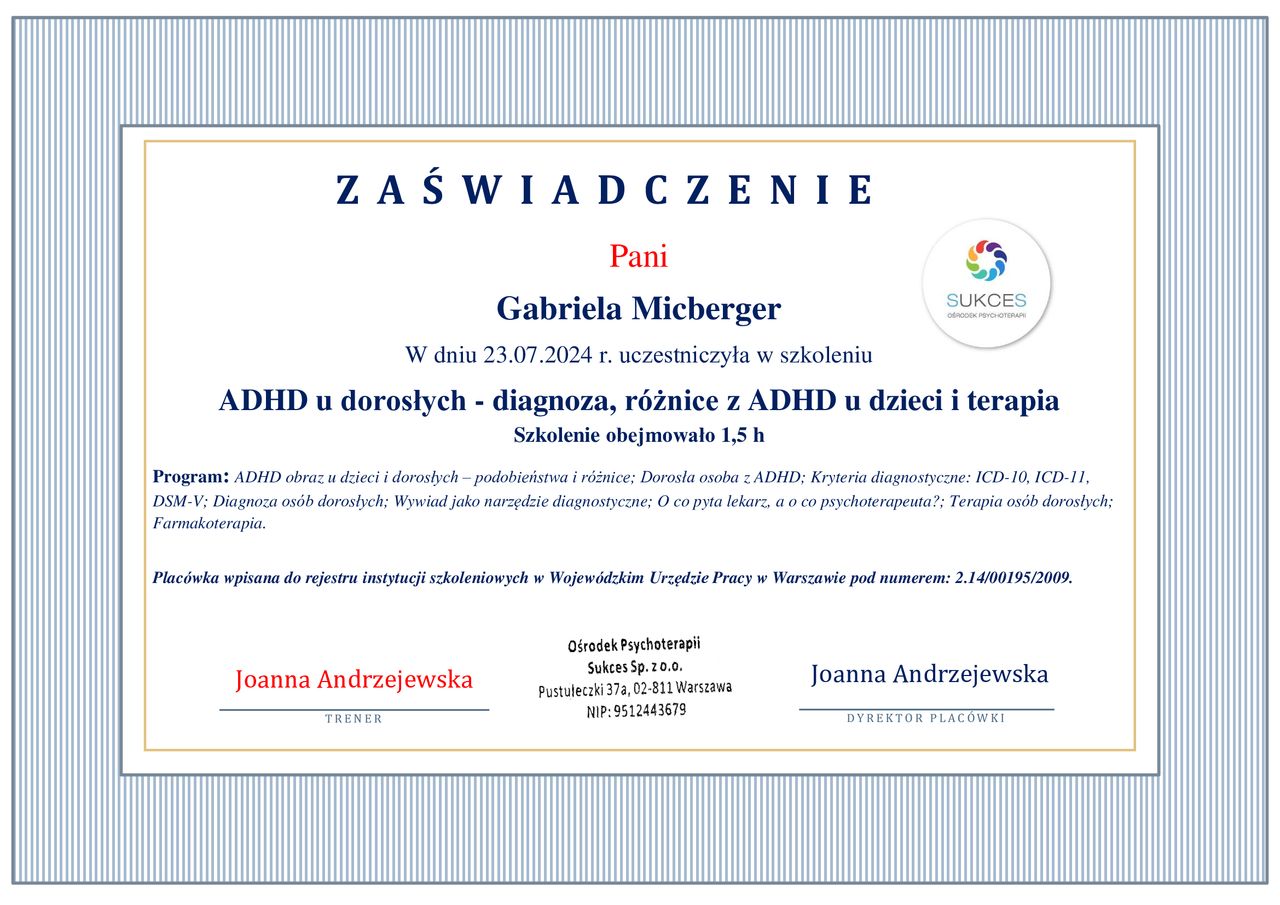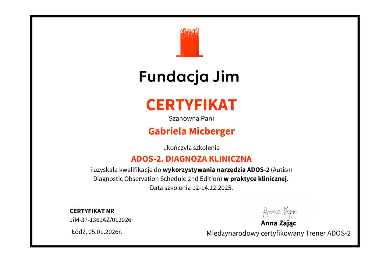 Jestem certyfikowaną diagnostką ADOS-2 - standaryzowanego narzędzia umożliwiającego profesjonalną diagnozę spektrum autyzmu. Szkolenie w tym zakresie odbyłam pod okiem specjalisty z Fundacji JiM. Ukończyłam również szkolenie z zakresu diagnostyki ADHD, rozwijając swój warsztat w obszarze różnicowania i rozpoznawania tego zaburzenia.