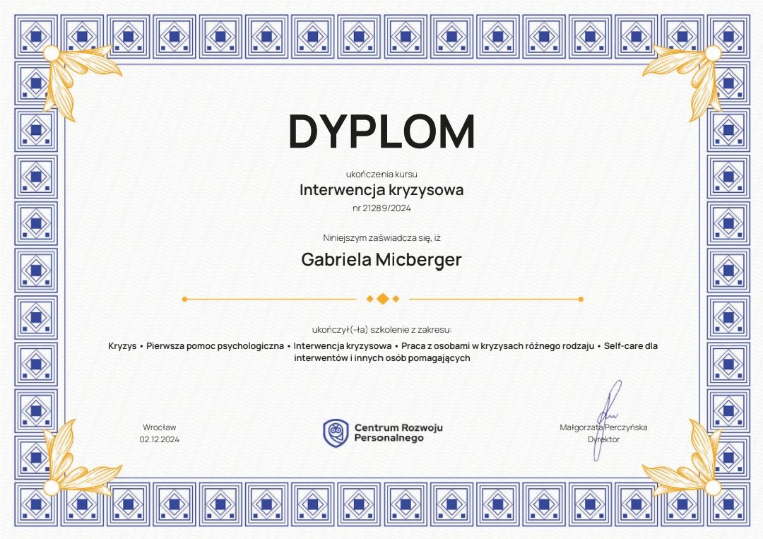 Ukończyłam szkolenie z interwencji kryzysowej, co pozwala mi skutecznie wspierać osoby w nagłych, obciążających momentach życia. Aby stale podnosić swoje kompetencje i lepiej odpowiadać na potrzeby Pacjentów, realizuję obecnie studia podyplomowe z Psychotraumatologii. Rozwijam w ten sposób warsztat pracy z osobami po doświadczeniach traumatycznych, długotrwałym stresie oraz trudnych wydarzeniach życiowych.