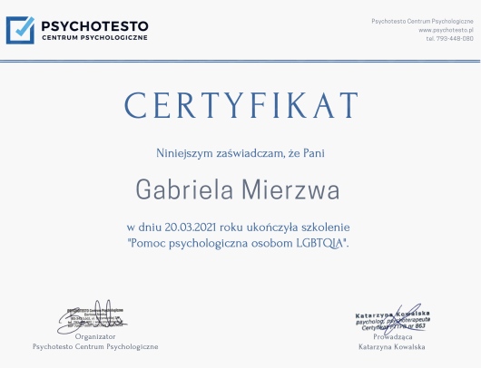 Serdecznie polecam Panią Gabriele Mierzwe każdemu, kto szuka wsparcia, profesjonalizmu i skutecznych rozwiązań w atmosferze zaufania i szacunku.