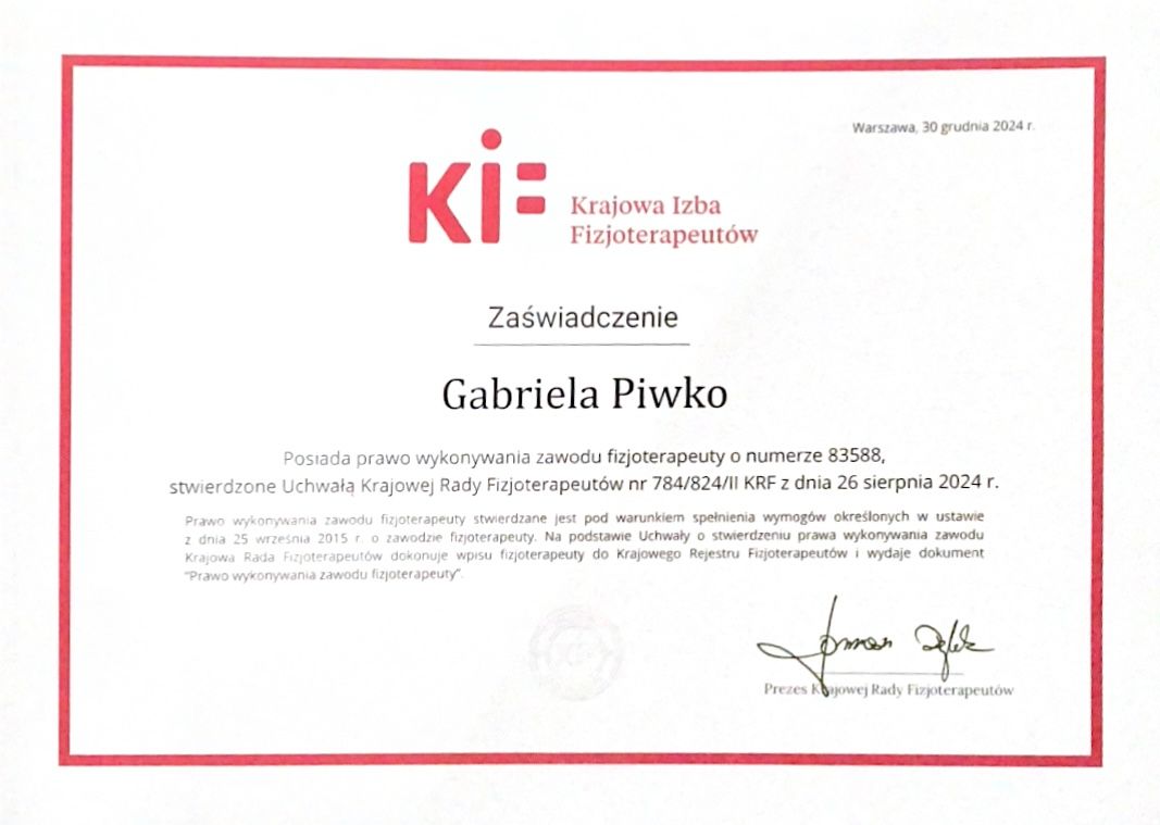 Stale podnoszę swoje kwalifikacje, uczestnicząc w szkoleniach na terenie całej Polski. Obecnie biorę udział w wielomiesięcznym kursie z zakresu fizjoterapii uroginekologicznej, akredytowanym przez Polskie Towarzystwo Uroginekologiczne.