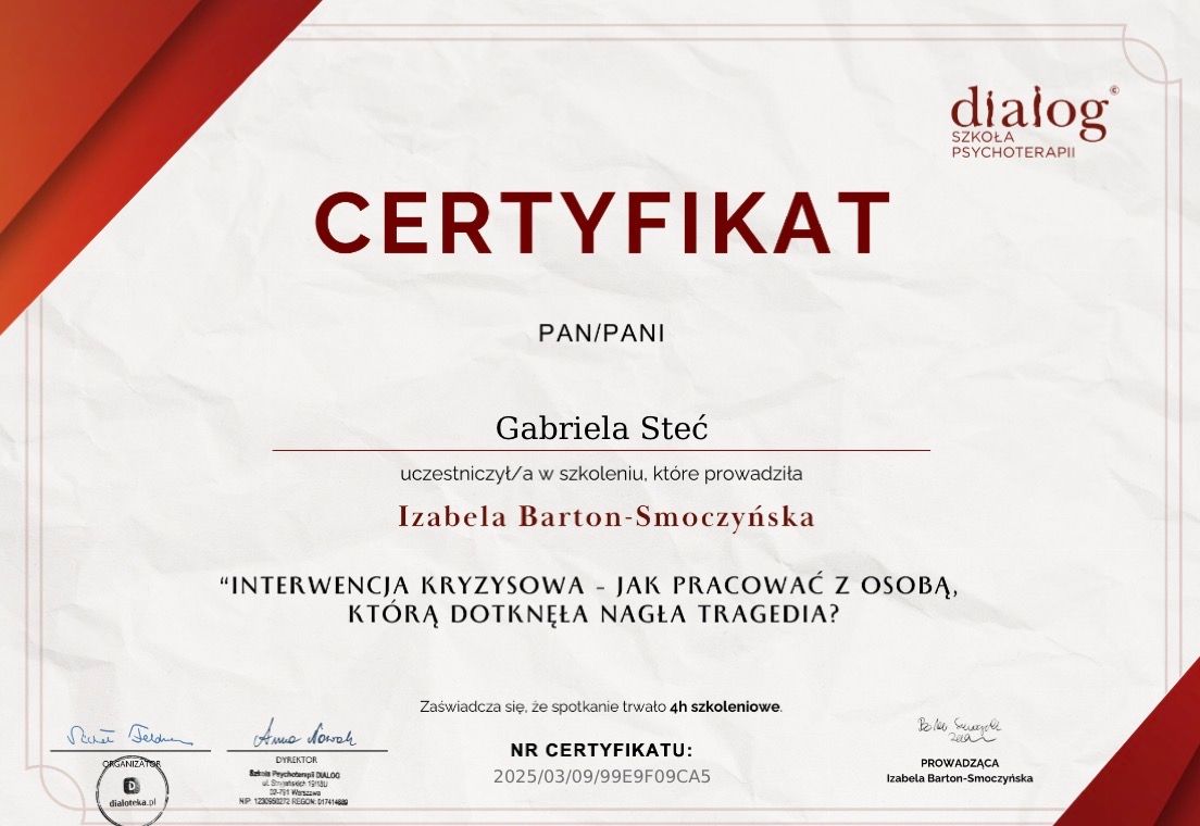 Pani Gabriela to prawdziwa profesjonalistka - o niezwykłym cieple i życzliwości, które czuć już od pierwszego spotkania. W bardzo krótkim czasie potrafiła pomóc mi odnaleźć spokój i zrozumienie w sytuacji, która wydawała się przytłaczająca. Jej uważność, delikatność i autentyczne zaangażowanie sprawiają, że człowiek czuje się naprawdę wysłuchany i bezpieczny. Jestem ogromnie wdzięczna za wsparcie, jakie od niej otrzymałam. Z całego serca polecam Panią Gabrielę każdemu, kto potrzebuje profesjonalnej, a jednocześnie ciepłej i pełnej empatii pomocy.