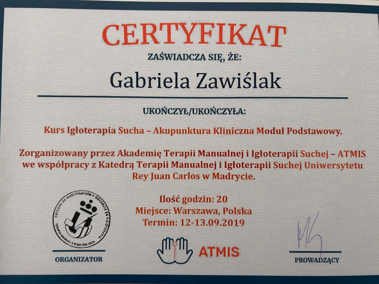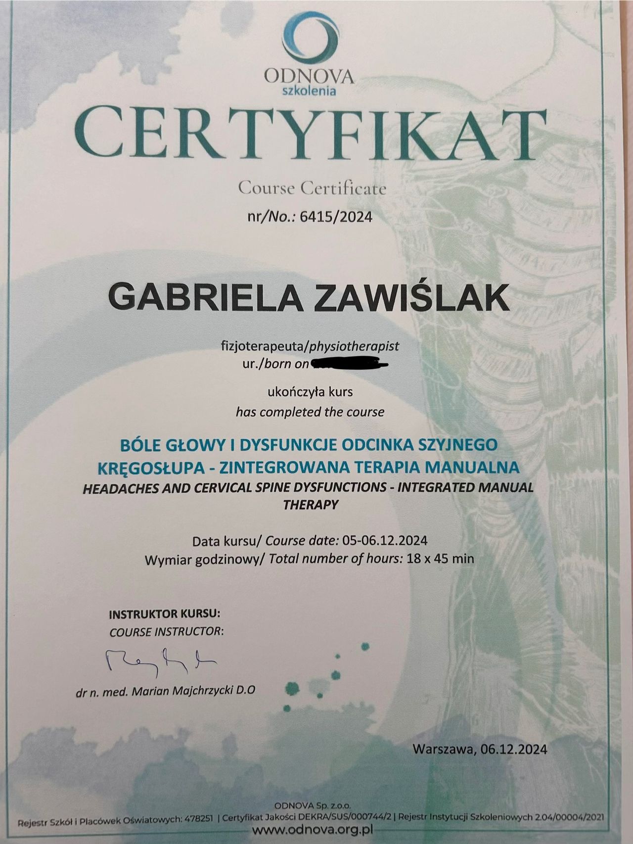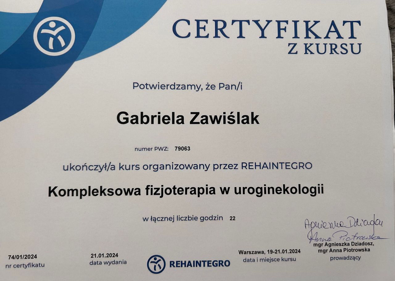 Specjalizuję się w diagnostyce i rehabilitacji schorzeń kręgosłupa i stawów. Ukończyłam Wyższą Szkołę Rehabilitacji w Warszawie. Ukończyła liczne szklenia w zakresie metod specjalistycznych w fizjoterapii. Swoje doświadczanie nabyłam w pracy z pacjentami w klinikach w Warszawie, a wcześniej szpitalu specjalistycznym w Chorwacji i w Biruni University Hospital, Yeditepe University Hospitals, w Stambule w Turcji. W pracy stawiam na rzetelną ocenę problemu i terapię dopasowaną do Ciebie bez schematów i przypadkowych ćwiczeń.