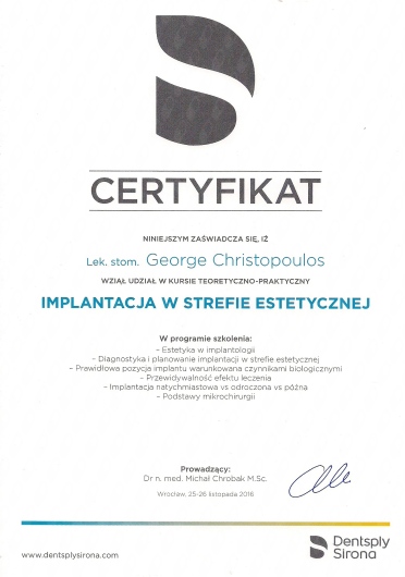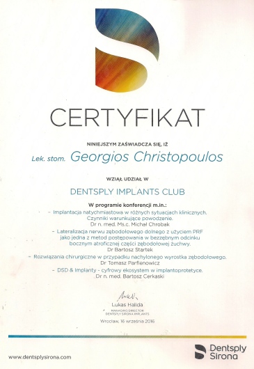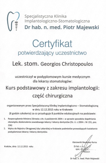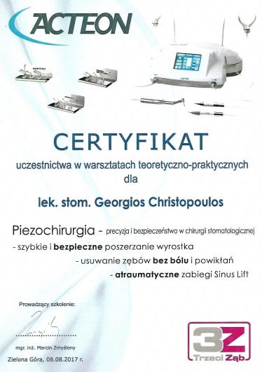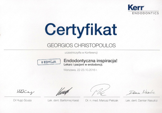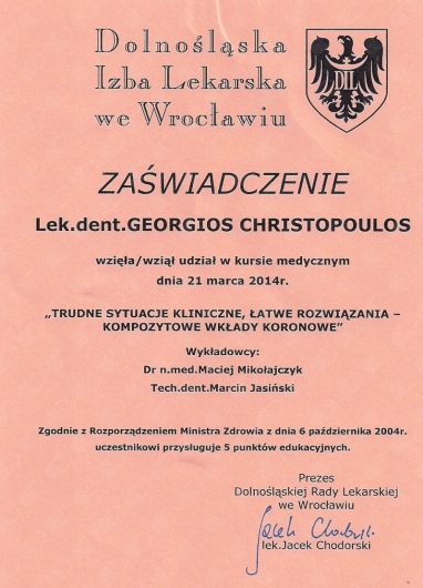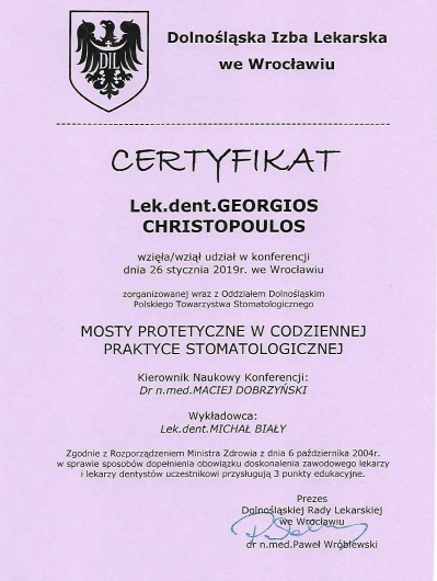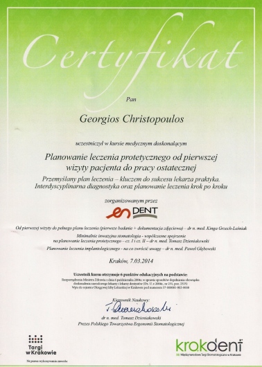 Od ponad 10 lat korzystam z pomocy Dr Georgiosa w podstawowym leczeniu a także skomplikowanych zabiegach w leczeniu zębów. To najbardziej zaangażowany i skupiony na pacjencie stomatolog z jakim miałem do czynienia. Jest bardzo staranny i precyzyjny. Oprócz wykonania leczenia Dr Georgiosa zawsze udziela bardzo pomocnych porad i wskazówek dotyczących dbania zęby/ jamę ustną. Ponadto świetnie komunikuje się z pacjentem i dba, by wizyta zawsze przebiegała w luźnej atmosferze i bez stresu. Zdecydowanie polecam!!!