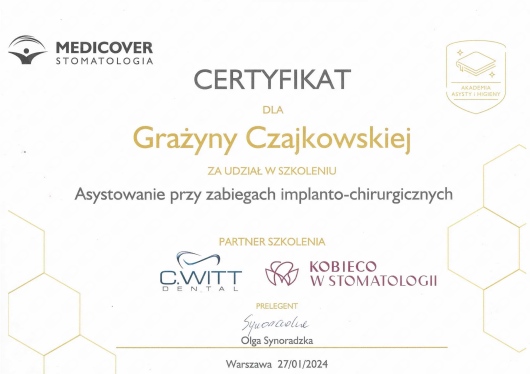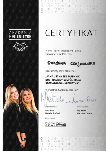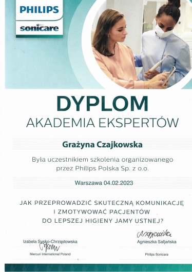 Pani Grażyna poświęca pacjentom całą swoją uwagę, do każdego podchodzi indywidualnie. Wyjaśnia szczegóły procedur i uprzedza, jakie doznania mogą pojawić się podczas zabiegu. Pacjent może w każdej chwili zasygnalizować, jeśli potrzebuje przerwy. Specjalistka udziela konstruktywnej informacji zwrotnej, doradza w jaki sposób lepiej zadbać o higienę zębów we własnym zakresie, a po zastosowaniu jej rad przekonałam się, że faktycznie stan higieny zębów poprawił się w następnym roku. Na wizytę musiałam poczekać kilkanaście minut, ale wynikło to z przedłużonej wizyty poprzedniego pacjenta, co może wiązać się z tym, że również zadbano o to, aby zaspokoić jego indywidualne potrzeby. Serdecznie polecam Panią Czajkowską na higienizację zębów, jest profesjonalnie, udziela dobrych rad i w gabinecie nie ma stresu.