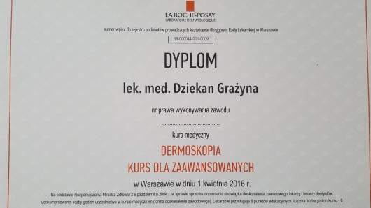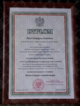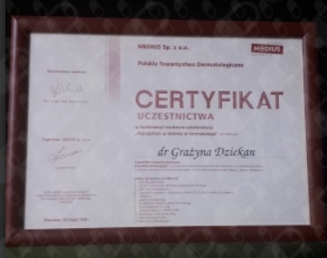 Jaki jest zakres porad oferowanych przez Grażyna Dziekan?Grażyna Dziekan to dermatolog. Na podstawie swojego doświadczenia i wykształcenia Grażyna Dziekan oferuje usługi takie jak: konsultacja dermatologiczna, Konsultacja dermatologiczna dzieci.