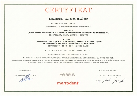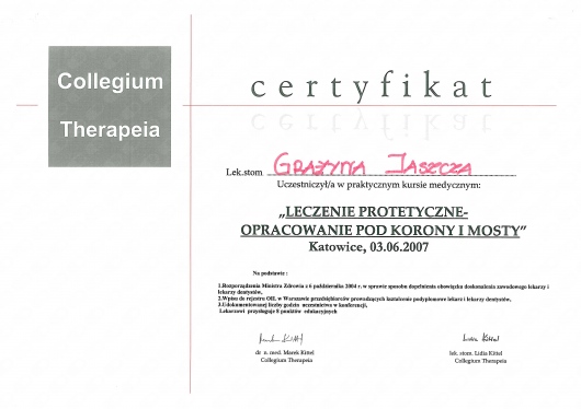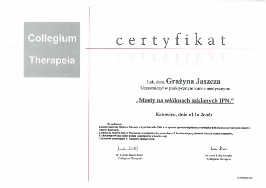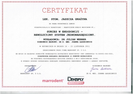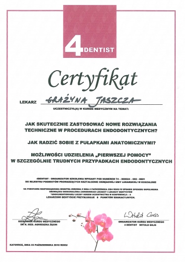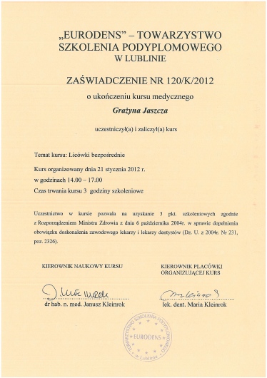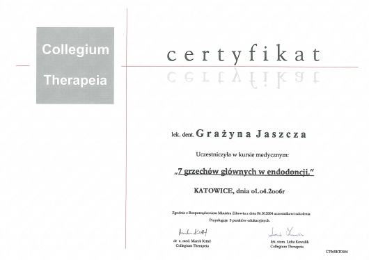 Nieustannie rozwijam swoje kompetencje, biorąc udział w licznych szkoleniach i kursach z zakresu endodoncji, protetyki, stomatologii estetycznej oraz chirurgii stomatologicznej – do tej pory ukończyłam ich już ponad 40. W mojej codziennej pracy stawiam na indywidualne podejście do pacjenta, dokładność oraz komfort leczenia.