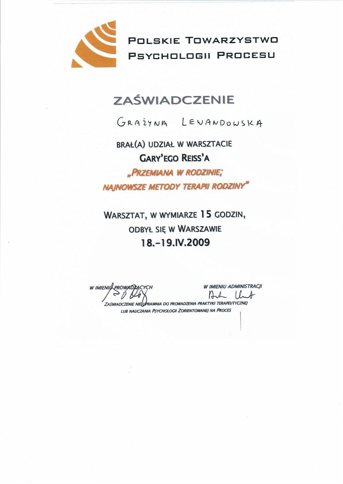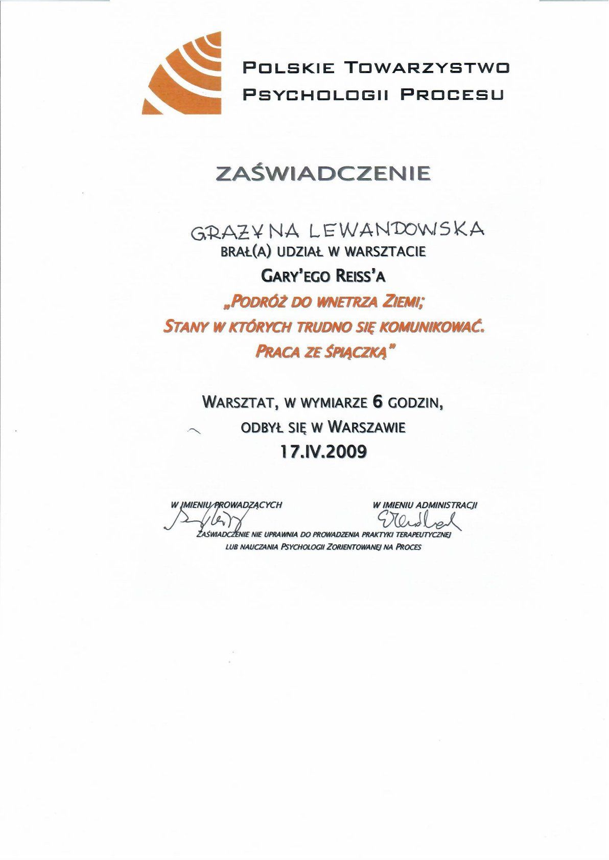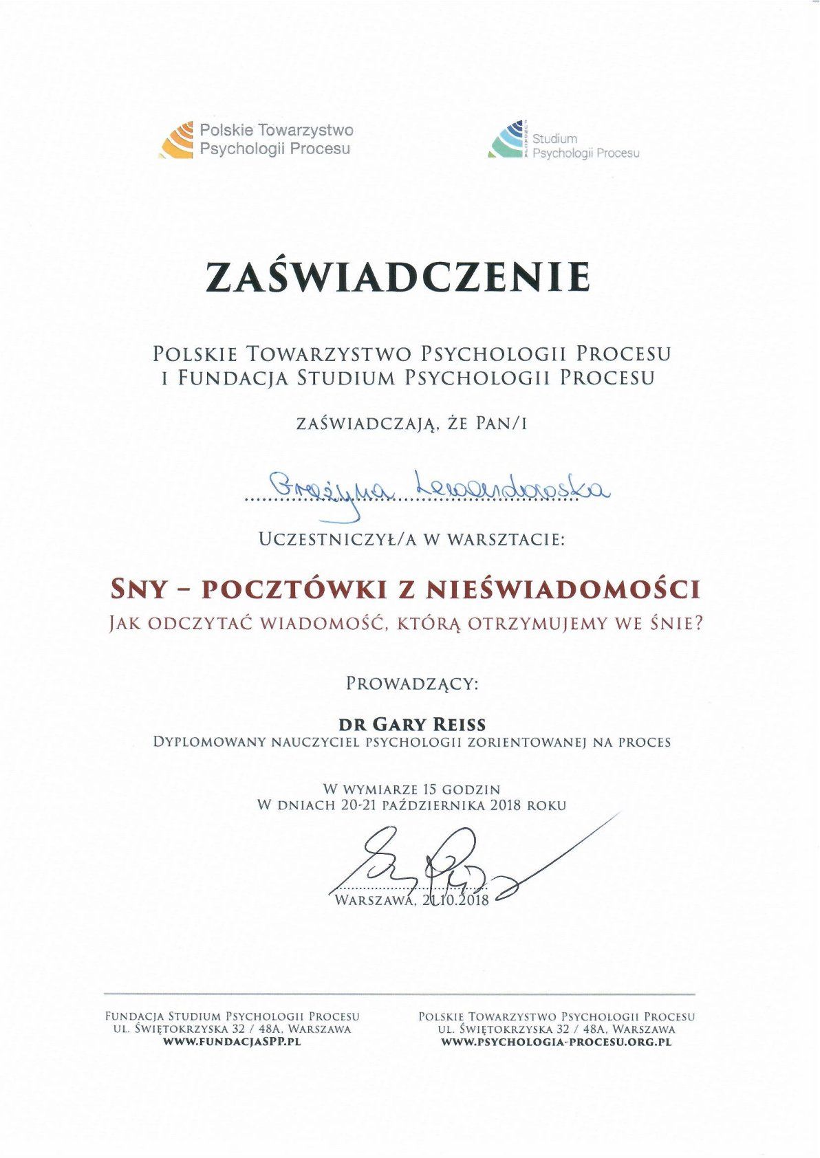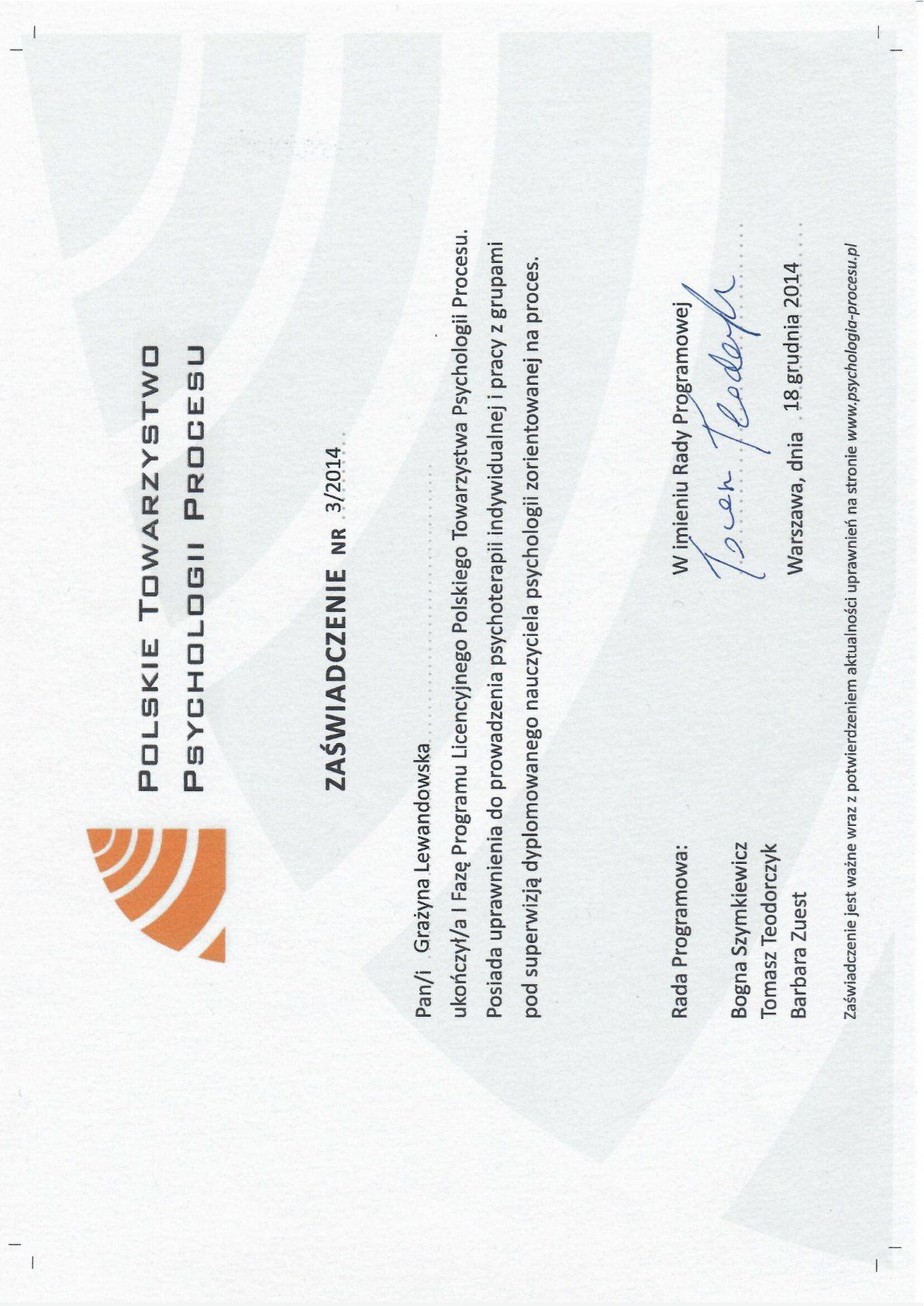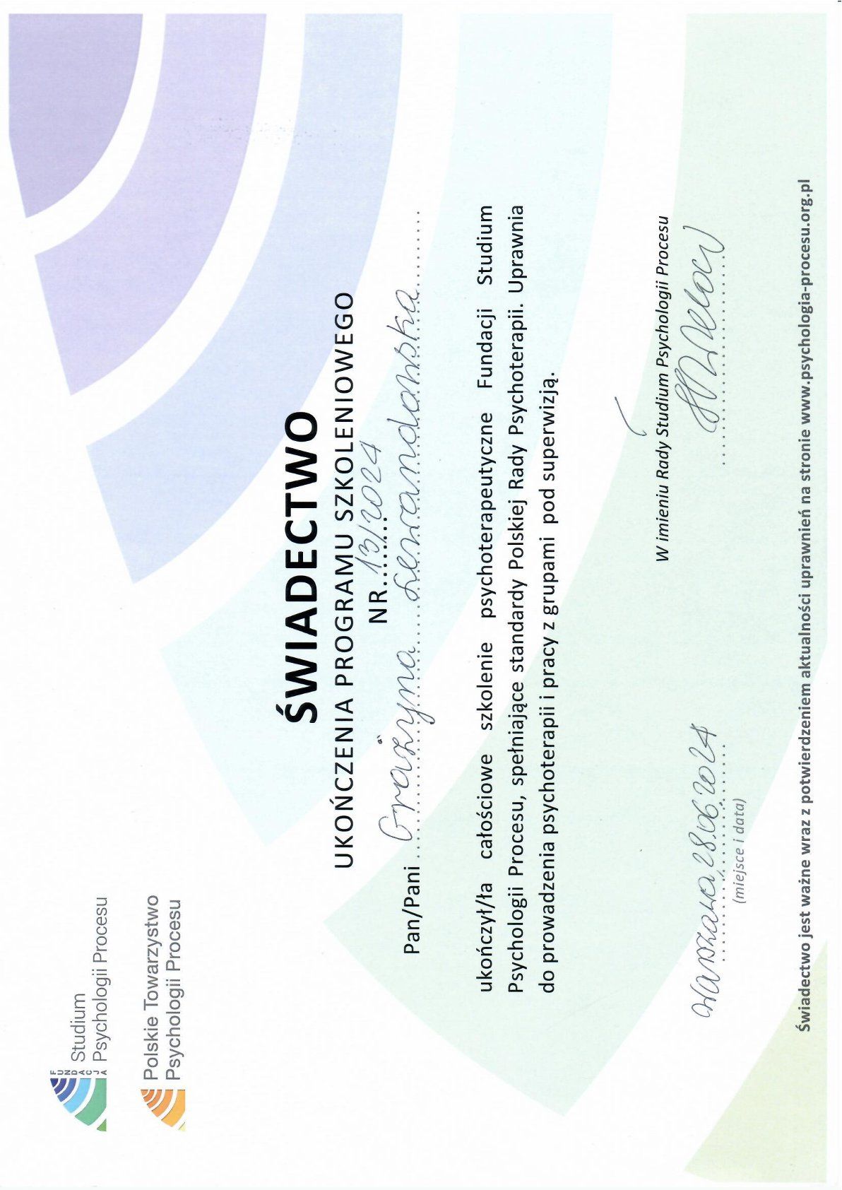 Posiadam uprawnienia do prowadzenia psychoterapii indywidualnej i pracy z grupami pod superwizją. Jestem absolwentką biologii na Uniwersytecie Łódzkim. Ukończyłam pięcioletni, całościowy program Szkoły Psychoterapii akredytowanej przez Polskie Towarzystwo Psychologii Procesu. Szkoliłam się w ustawieniach systemowych u Marka Wilkirskiego. Odbyłam również szkolenie EMDR Europe. Przez wiele lat współprowadziłam warsztaty Progi Życia oraz samodzielnie prowadziłam Kręgi Kobiet. Doświadczenie kliniczne zdobywałam w Domu Pomocy Społecznej w Górze Kalwarii, gdzie pracowałam z osobami z różnymi zaburzeniami psychicznymi.