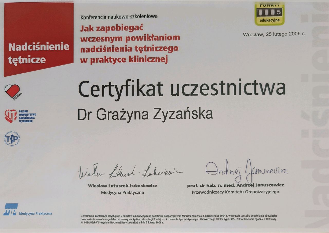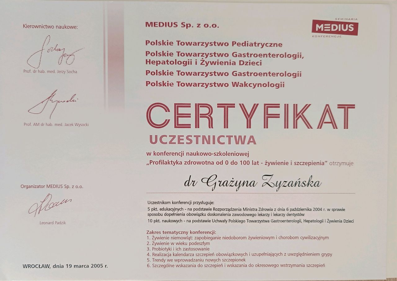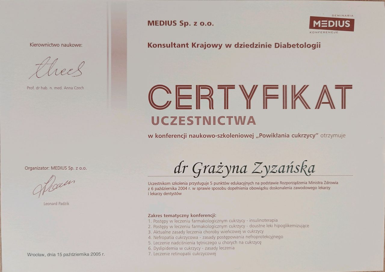 Jak Grażyna Zyzańska umawia wizyty?Grażyna Zyzańska używa kalendarza ZnanyLekarz, dlatego na stronie widzisz aktualne terminy. Wystarczy, że wybierzesz datę i godzinę, które odpowiadają Ci najbardziej. Umawianie wizyty jest darmowe, a tuż przed terminem wyślemy Ci przypomnienie.