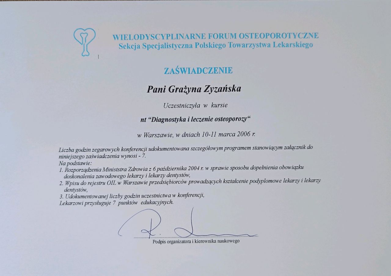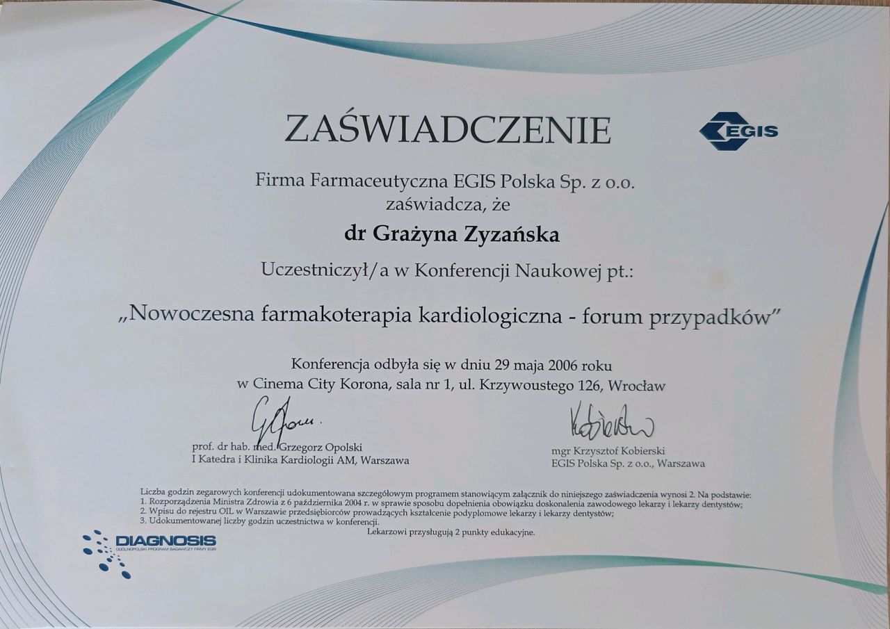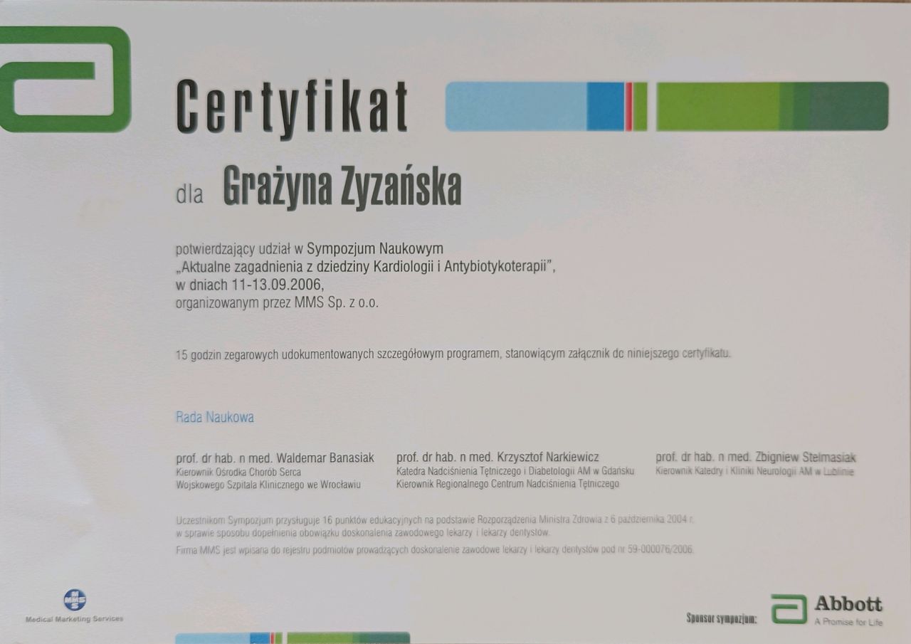 Jak Grażyna Zyzańska umawia wizyty?Grażyna Zyzańska używa kalendarza ZnanyLekarz, dlatego na stronie widzisz aktualne terminy. Wystarczy, że wybierzesz datę i godzinę, które odpowiadają Ci najbardziej. Umawianie wizyty jest darmowe, a tuż przed terminem wyślemy Ci przypomnienie.