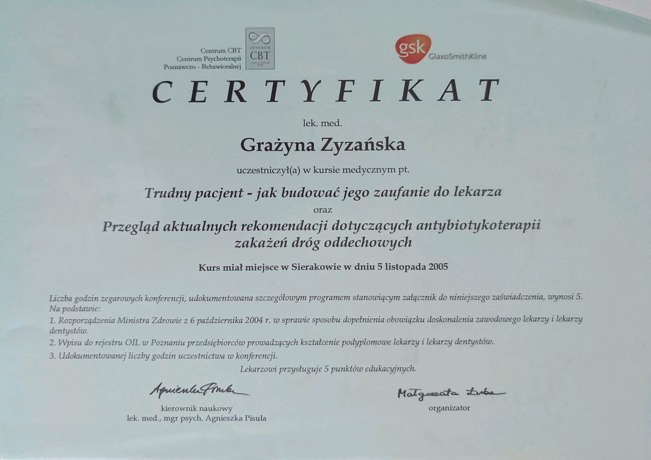 Grażyna Zyzańska: co mówią pacjenci?5 osób dodało swoją opinię. Grażyna Zyzańska ma średnią ocen 4.5 (na 5 gwiazdek).