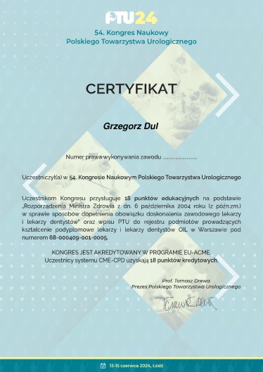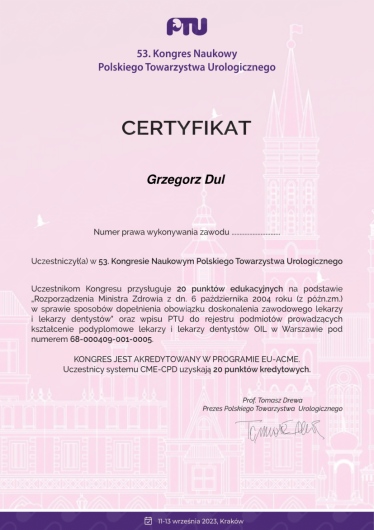 Jaki jest zakres porad oferowanych przez Grzegorz Dul?Grzegorz Dul to urolog. Na podstawie swojego doświadczenia i wykształcenia Grzegorz Dul oferuje usługi takie jak: Konsultacja urologiczna dzieci, kwalifikacja do operacji, konsultacja urologiczna (pierwsza wizyta), konsultacja urologiczna, Konsultacja urologiczna + USG, USG prostaty, konsultacja urologiczna (kolejna wizyta), USG układu moczowego, Osocze bogatopłytkowe, wazektomia bez skalpela.