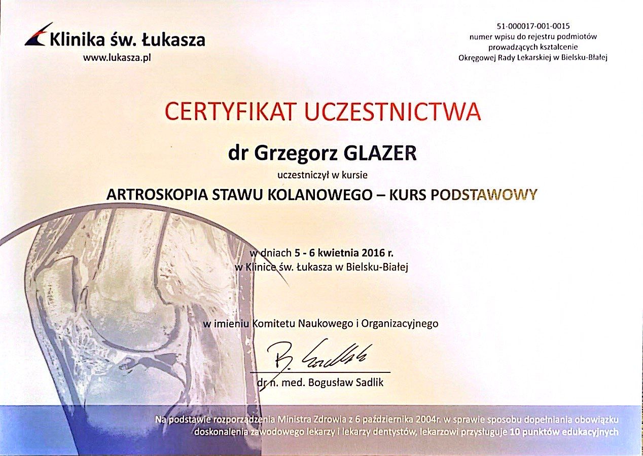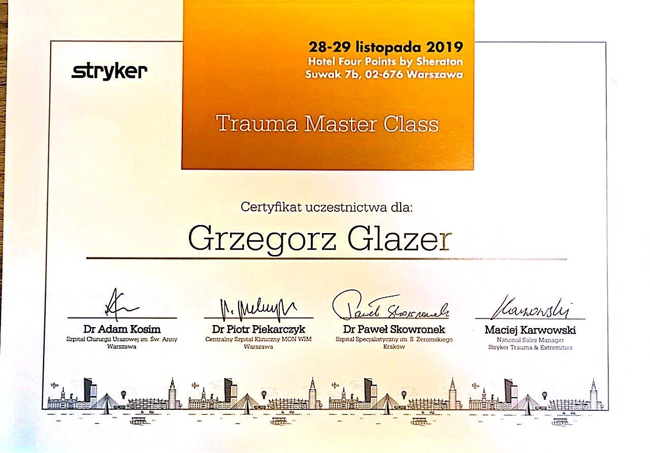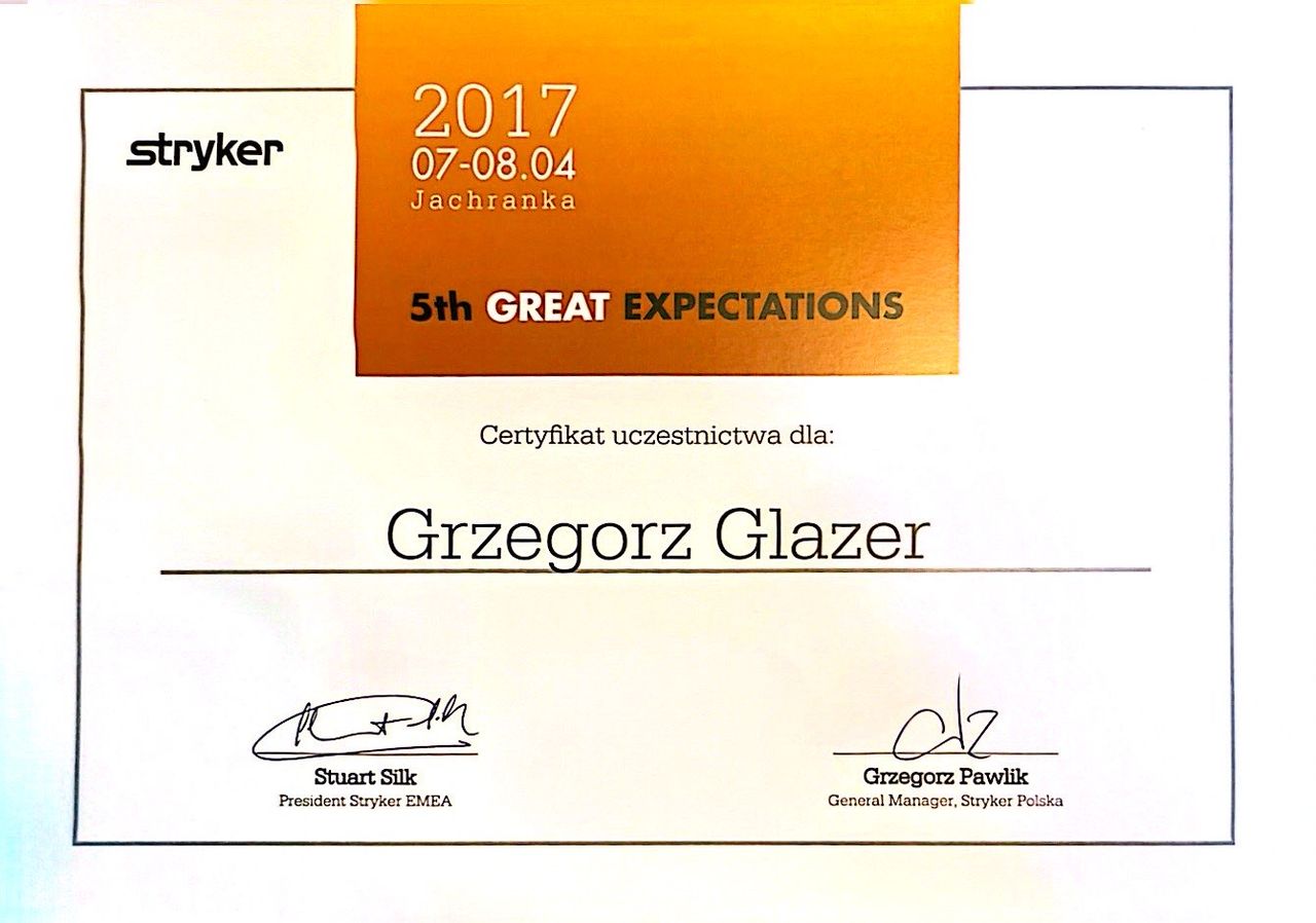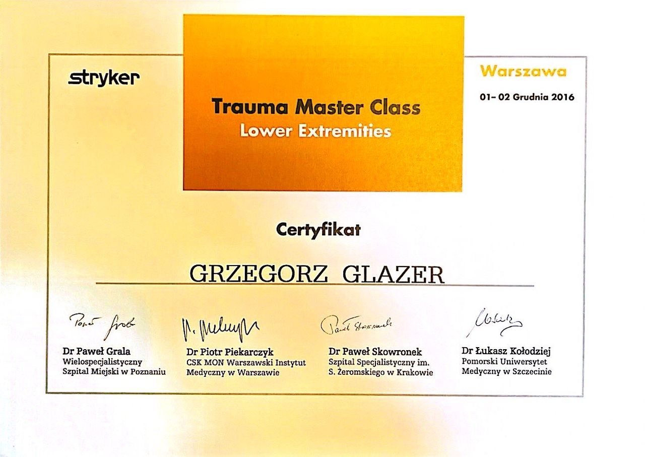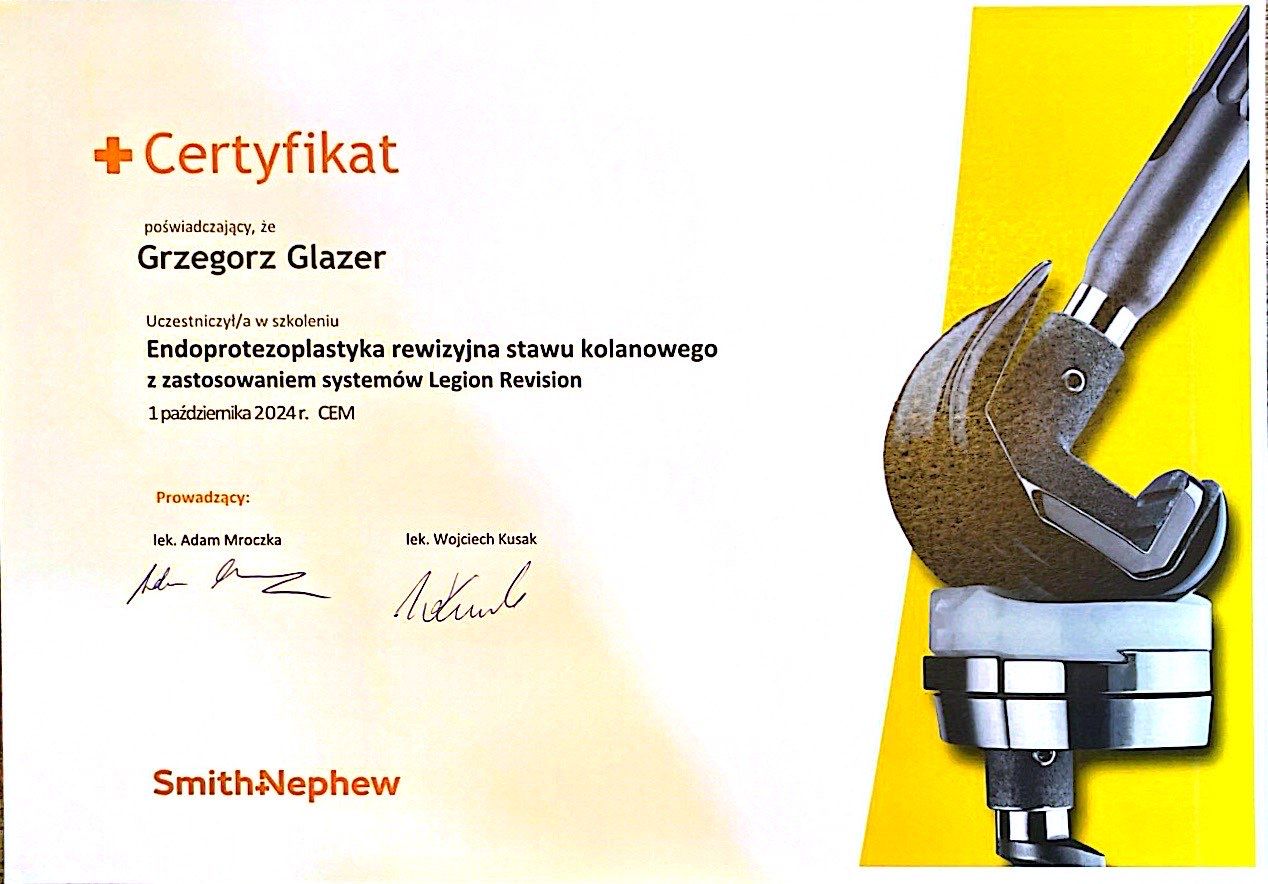 Nazywam się Grzegorz Glazer i jestem lekarzem specjalistą w dziedzinie ortopedii i traumatologii narządu ruchu. Ukończyłem studia na II Wydziale Lekarskim z Oddziałem Anglojęzycznym Uniwersytetu Medycznego w Lublinie w 2011 roku, uzyskując dyplom z wynikiem bardzo dobrym.