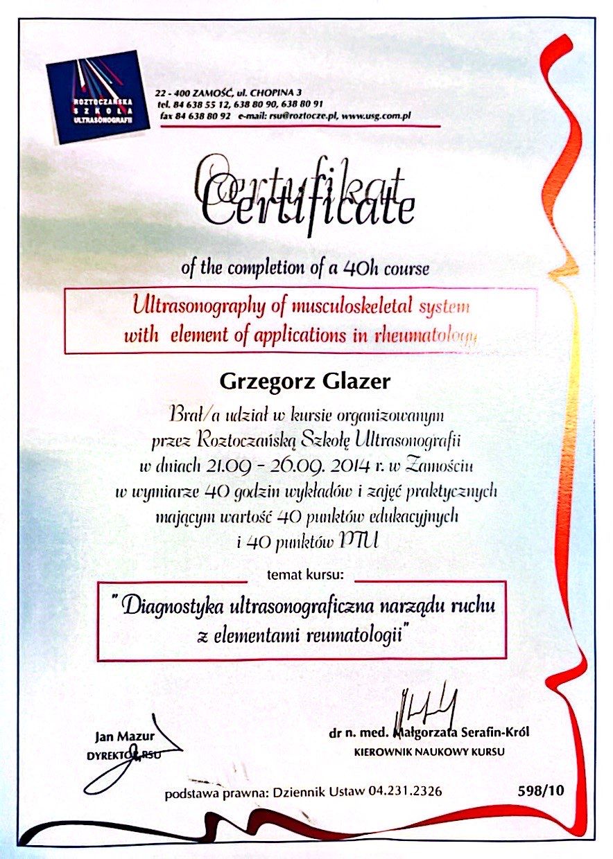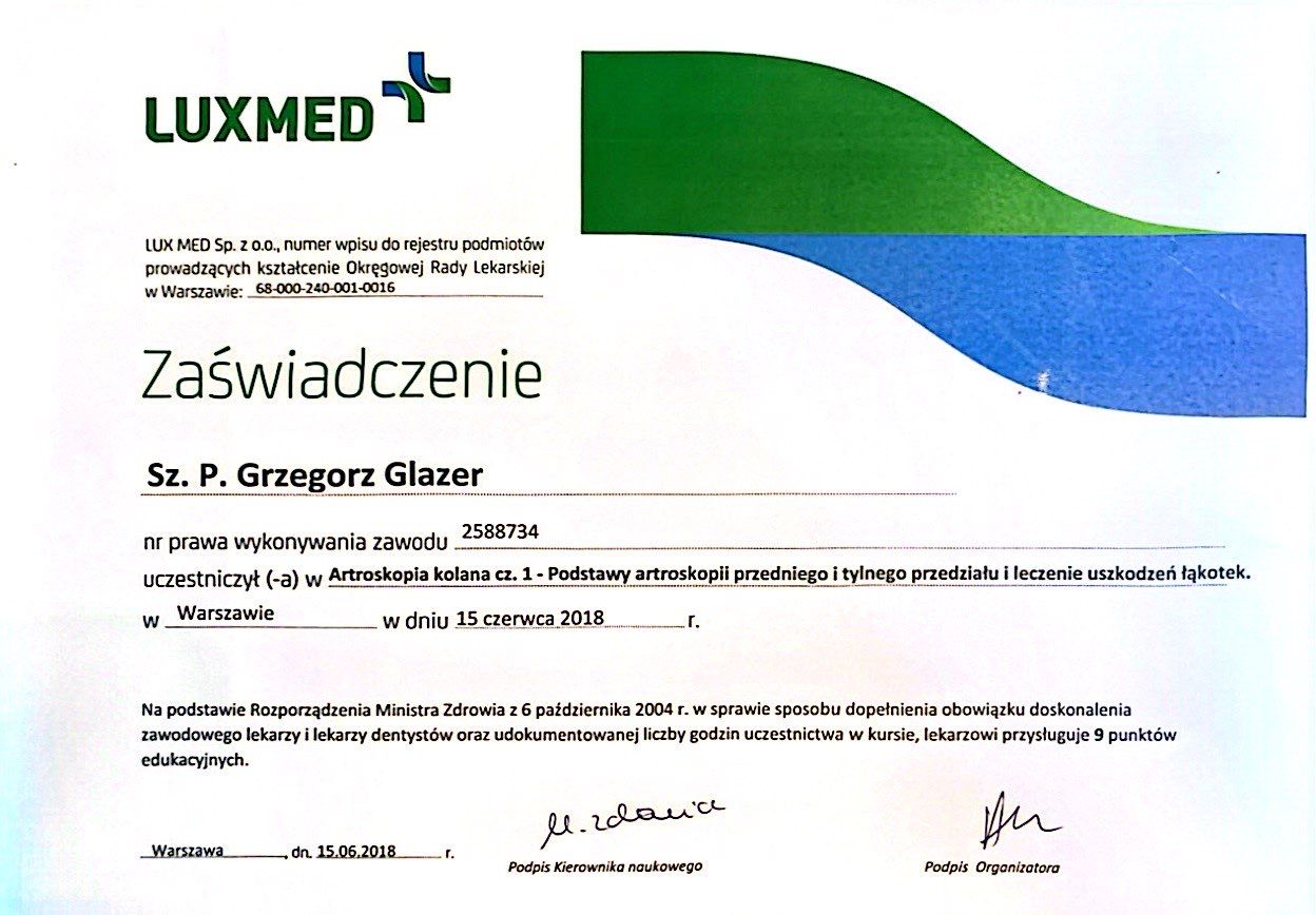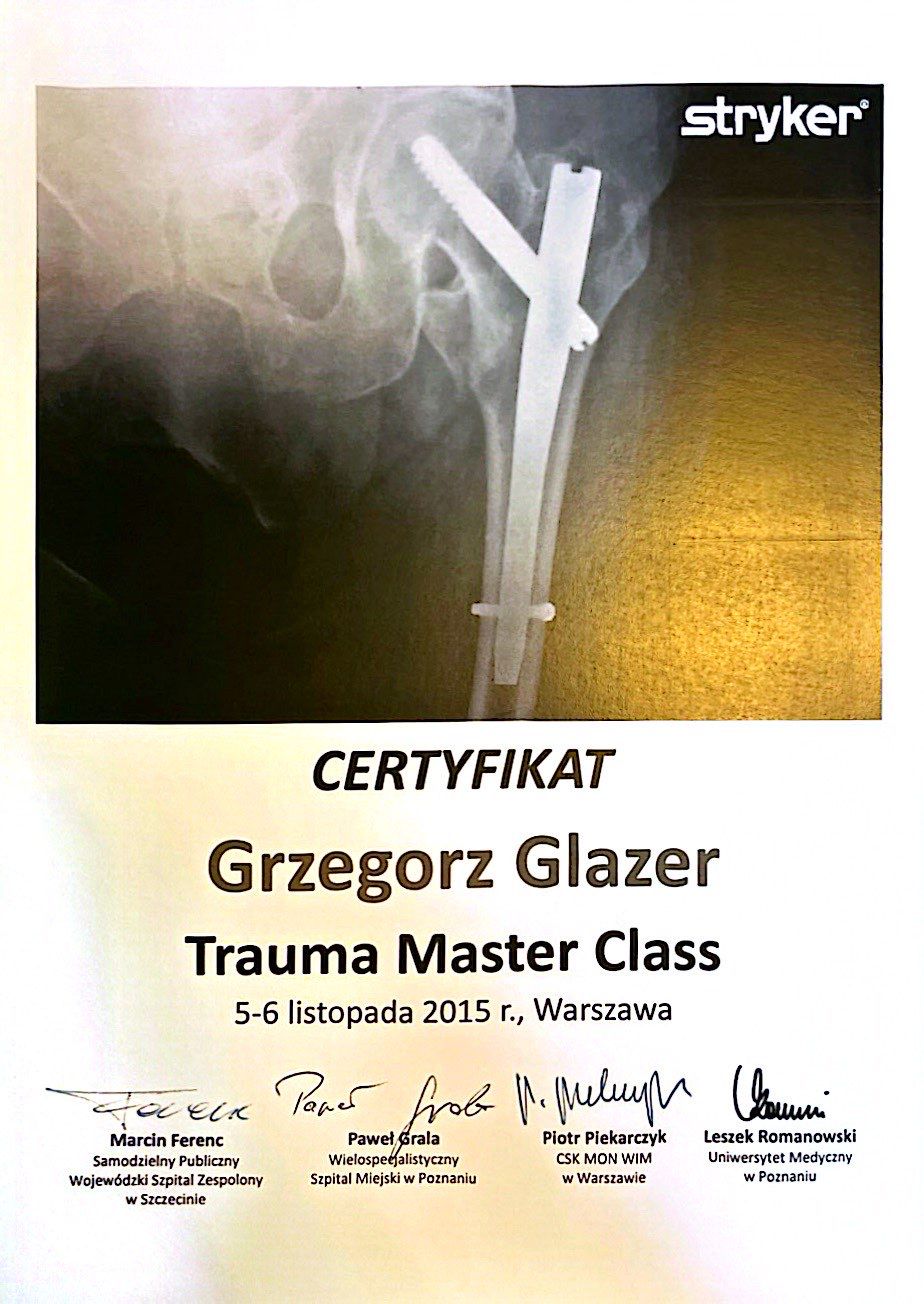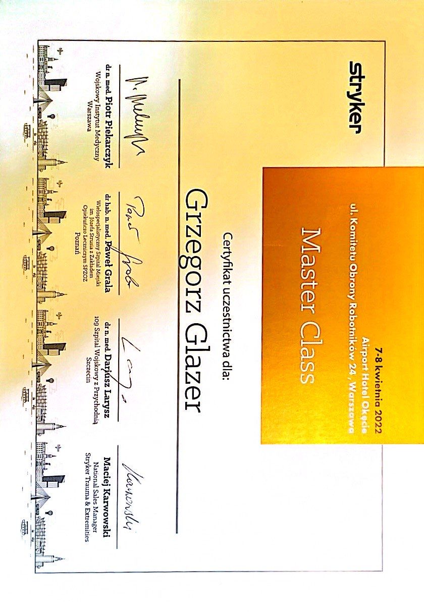 Nazywam się Grzegorz Glazer i jestem lekarzem specjalistą w dziedzinie ortopedii i traumatologii narządu ruchu. Ukończyłem studia na II Wydziale Lekarskim z Oddziałem Anglojęzycznym Uniwersytetu Medycznego w Lublinie w 2011 roku, uzyskując dyplom z wynikiem bardzo dobrym.