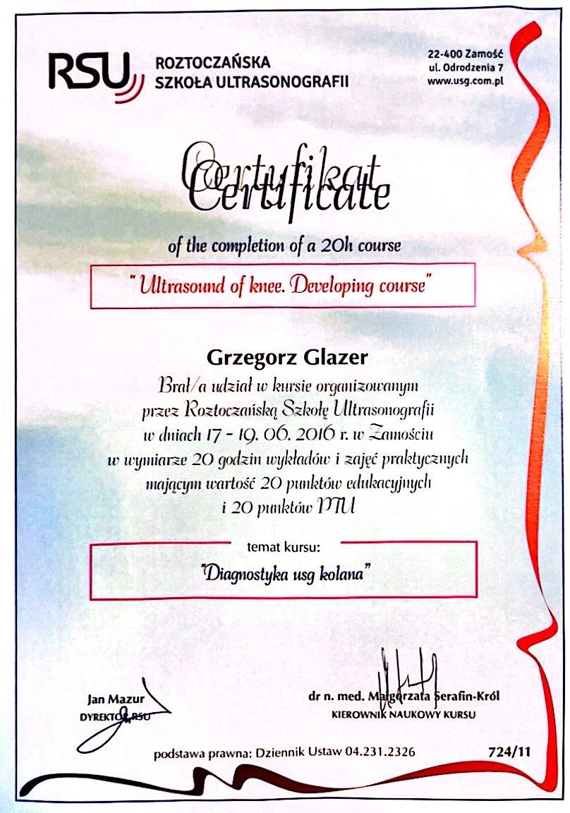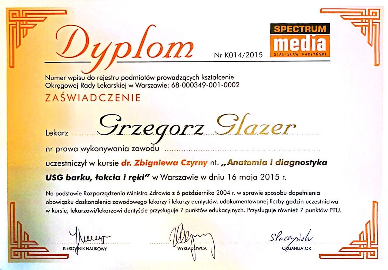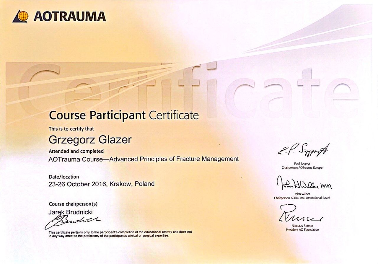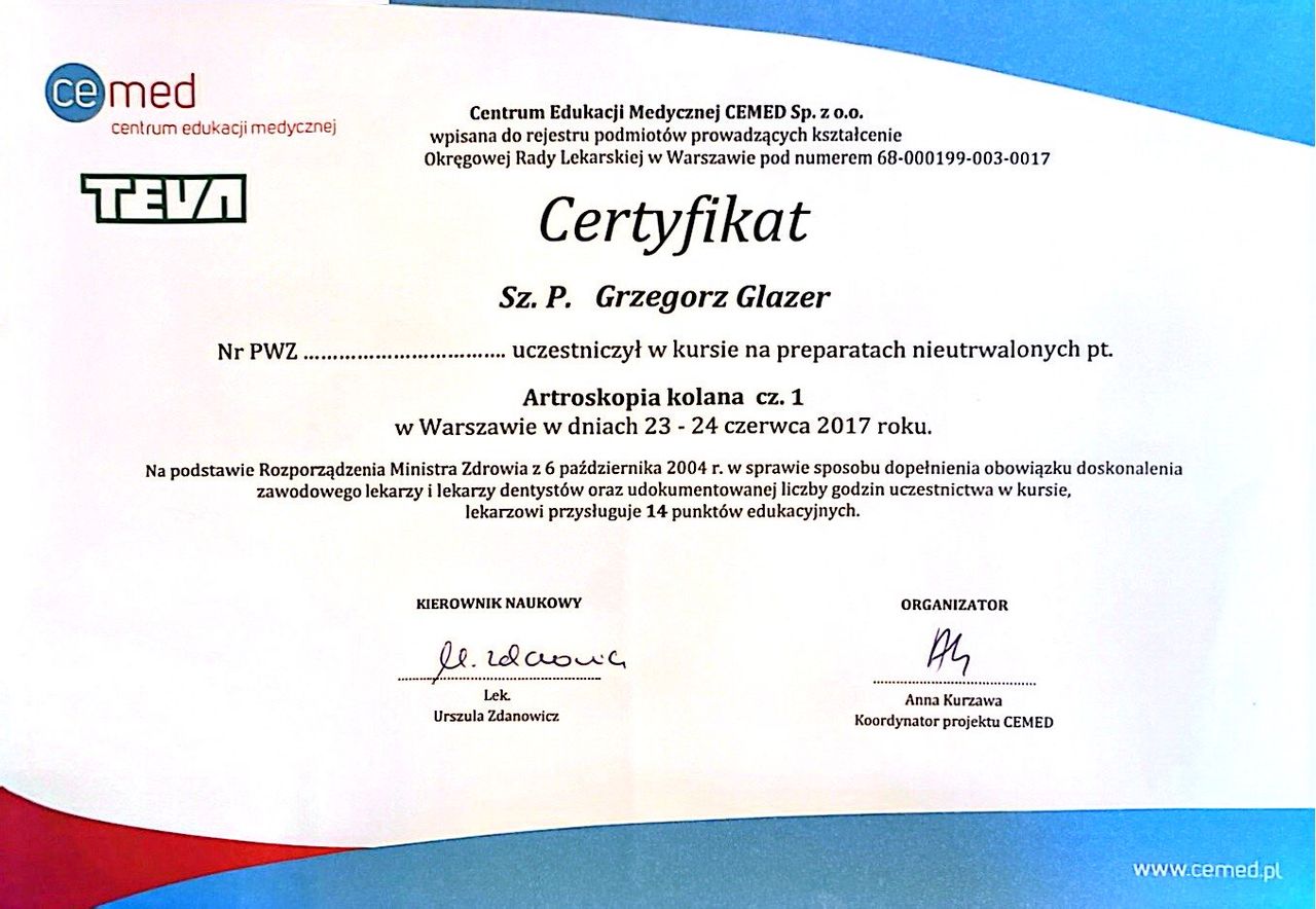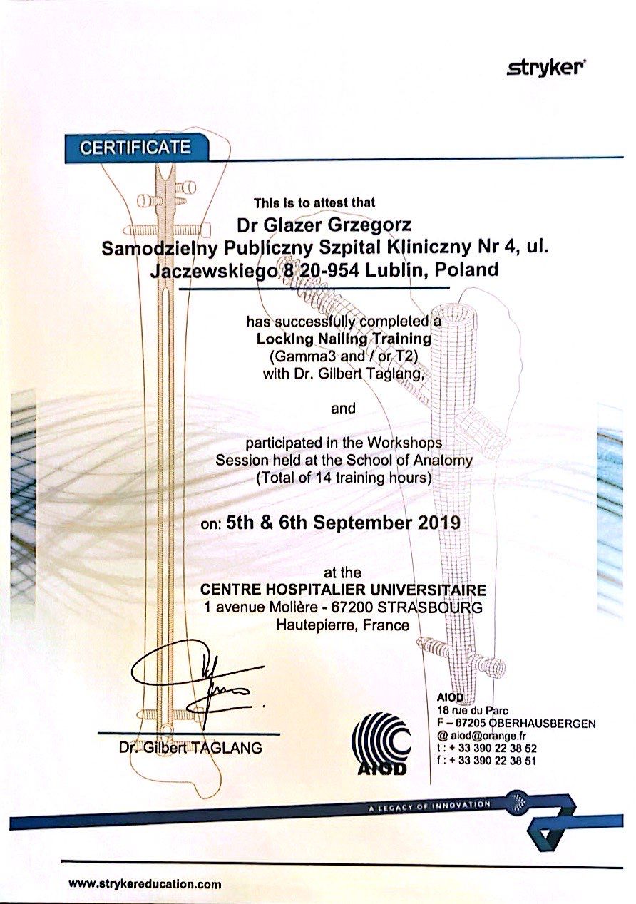 Nazywam się Grzegorz Glazer i jestem lekarzem specjalistą w dziedzinie ortopedii i traumatologii narządu ruchu. Ukończyłem studia na II Wydziale Lekarskim z Oddziałem Anglojęzycznym Uniwersytetu Medycznego w Lublinie w 2011 roku, uzyskując dyplom z wynikiem bardzo dobrym.
