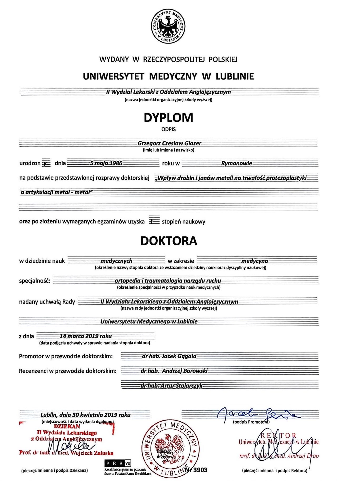 „Wpływ jonów i drobin metali na trwałość protezoplastyki metal-metal”, uzyskując stopień doktora nauk medycznych.