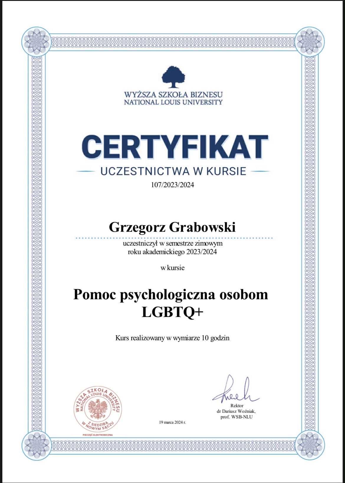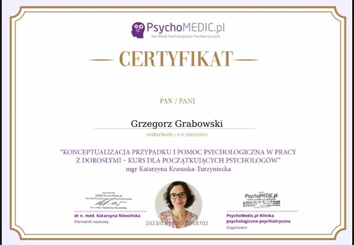 Jaki jest zakres porad oferowanych przez Grzegorz Grabowski?Grzegorz Grabowski to psycholog. Na podstawie swojego doświadczenia i wykształcenia Grzegorz Grabowski oferuje usługi takie jak: Konsultacja psychologiczna.