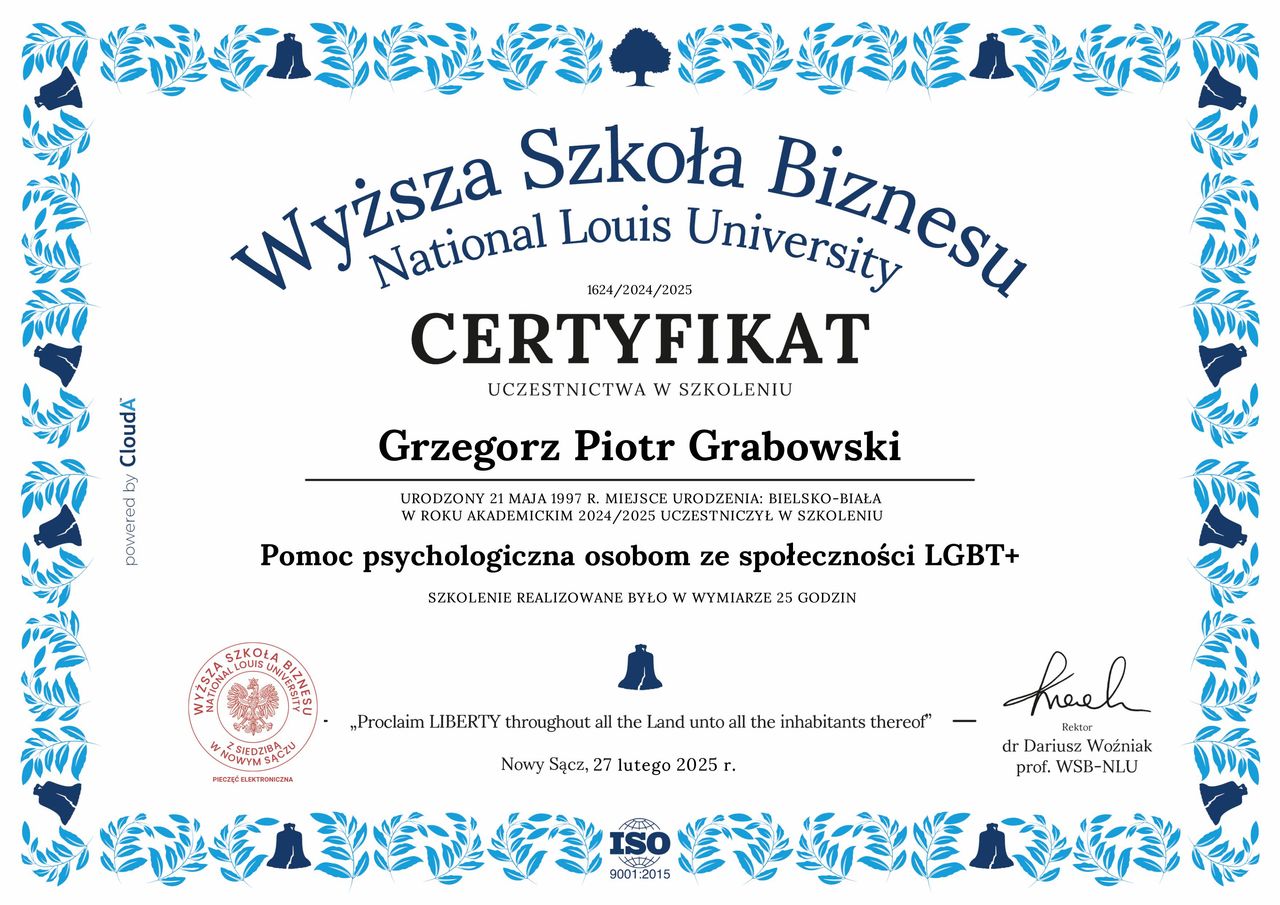 Jestem psychologiem, absolwentem jednolitych studiów magisterskich w specjalności psychologia kliniczna i osobowości.