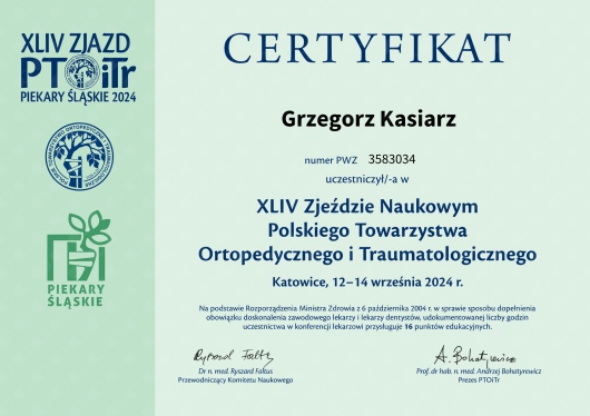 Jaki jest zakres porad oferowanych przez Grzegorz Kasiarz?Grzegorz Kasiarz to w trakcie specjalizacji (ortopeda). Na podstawie swojego doświadczenia i wykształcenia Grzegorz Kasiarz oferuje usługi takie jak: konsultacja ortopedyczna, konsultacja ortopedyczna + USG, konsultacja ortopedyczna + punkcja stawów, konsultacja ortopedyczna + iniekcja z kwasu hialuronowego.