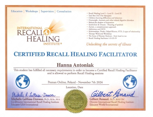 • Hanna Antoniak Psycholog, Konsultant Recall Healing • konsultacja psychosomatologiczna •