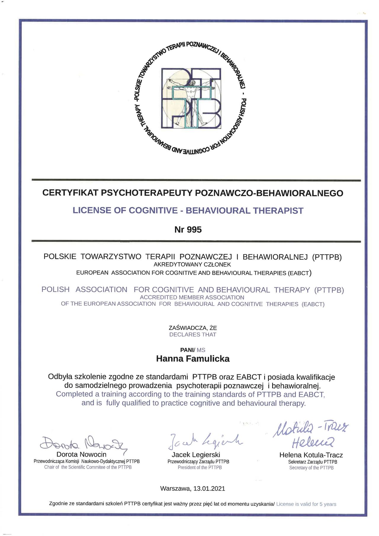 Jestem certyfikowaną psychoterapeutką poznawczo-behawioralną (PTTPB) oraz psycholożką specjalizującą się w pracy z osobami doświadczającymi trudności emocjonalnych i życiowych kryzysów. Ukończyłam pełne szkolenie DBT Comprehensive (Dialectical Behavior Therapy) oraz szkolenie w metodzie EMDR (Eye Movement Desensitization and Reprocessing), co pozwala mi na elastyczne dostosowanie sposobu pracy do potrzeb pacjenta.