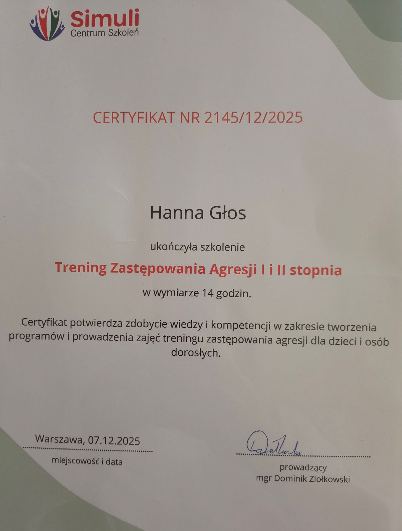 Pani Hanna to wspaniała specjalistka z ciepłym i empatycznym podejściem do młodzieży. Ma świetny kontakt z moją córką – potrafi ją wysłuchać, zrozumieć i zmotywować. Po spotkaniach córka jest spokojniejsza, bardziej pewna siebie i chętniej rozmawia o emocjach. Jesteśmy bardzo wdzięczni za profesjonalizm, zaangażowanie i serdeczną atmosferę. Z całego serca polecam!