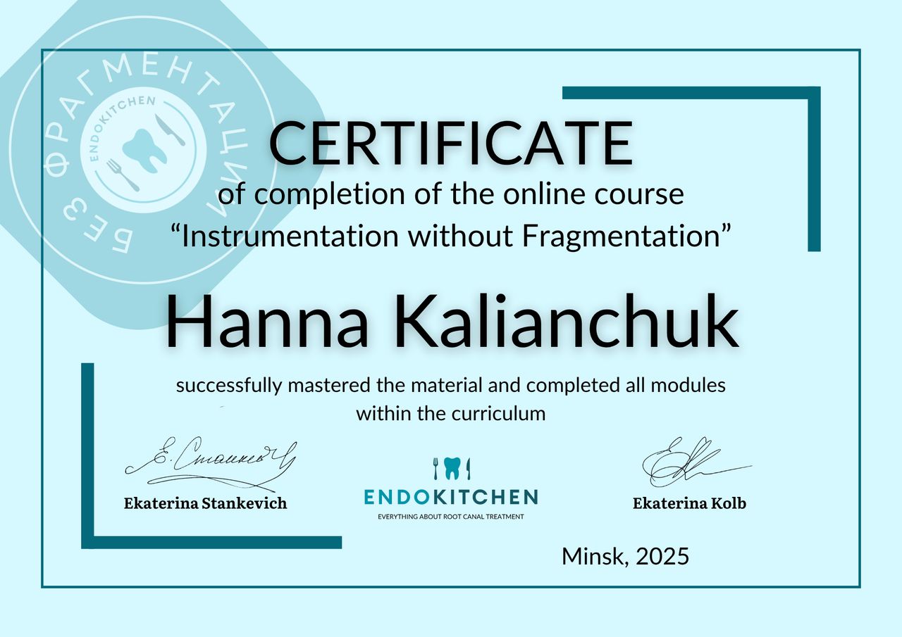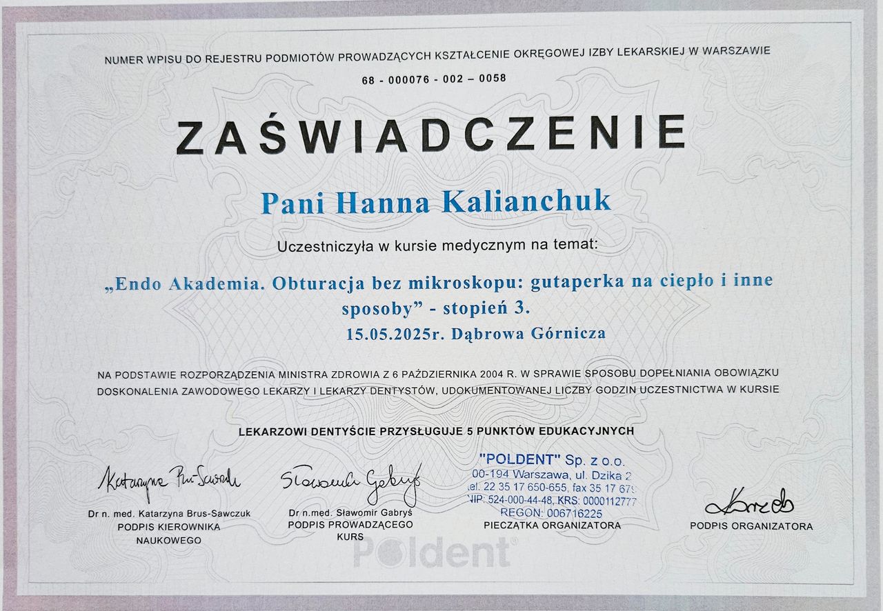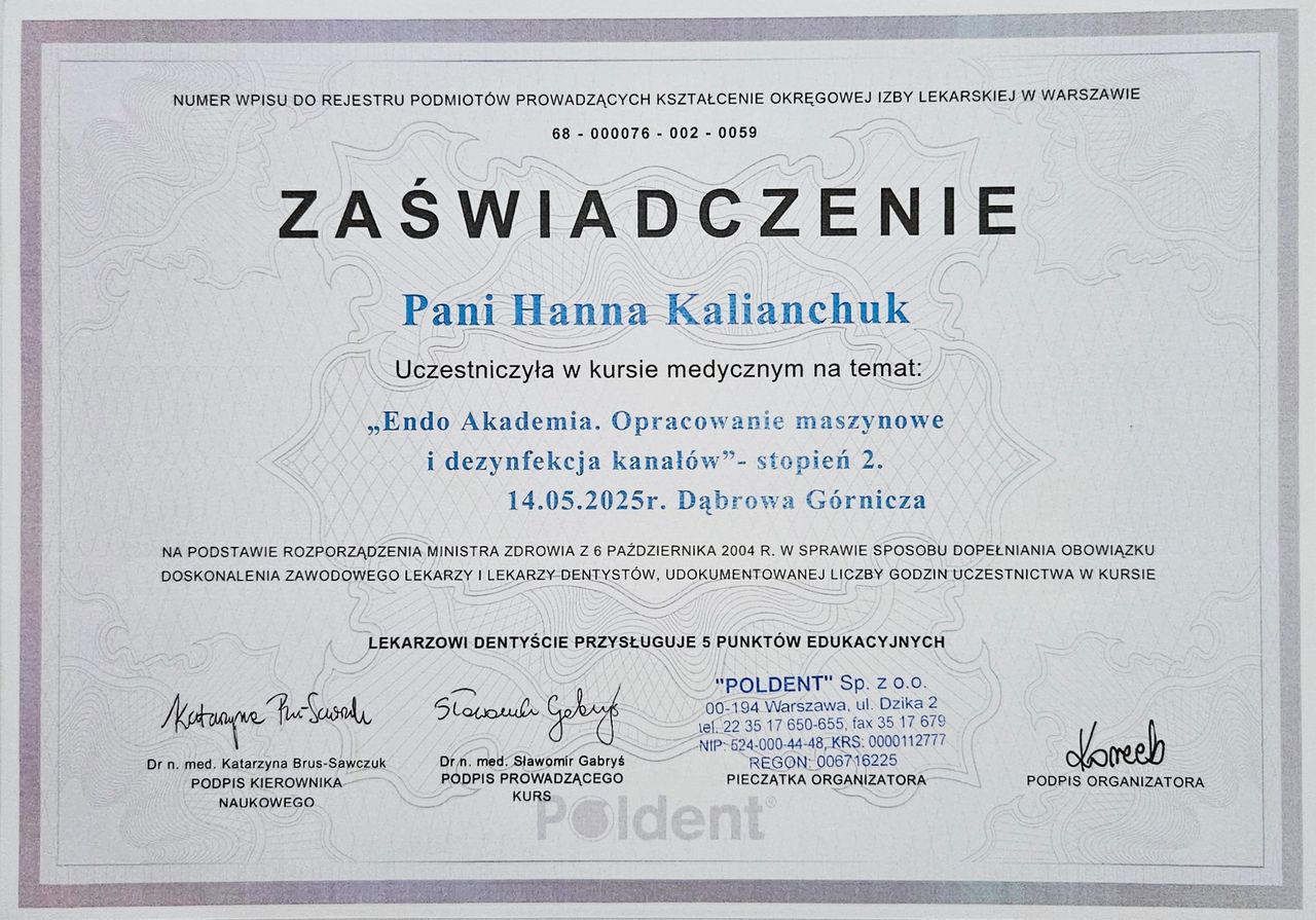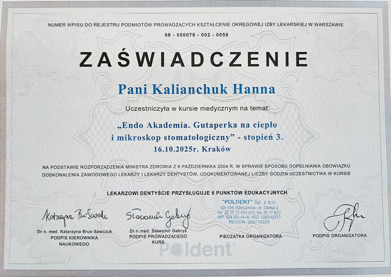 Nazywam się Hanna Kalianchuk, jestem lekarzem dentystą. Studia medyczne ukończyłam na Białoruskim Państwowym Uniwersytecie Medycznym w Mińsku w 2013r. W 2023 r. pomyślnie zdałam Lekarsko-dentystyczny Egzamin Weryfikacyjny w Łodzi i tym samym potwierdziłam swoje wykształcenie i kwalifikacje. Staż podyplomowy odbyłam w Uniwersyteckiej Klinice Stomatologicznej w Krakowie, gdzie miałam zaszczyt doskonalić swoje umiejętności pod okiem wybitnych specjalistów w dziedzinie stomatologii.