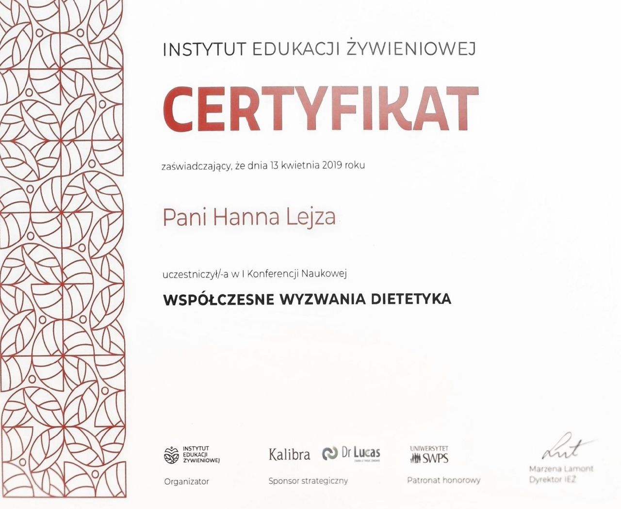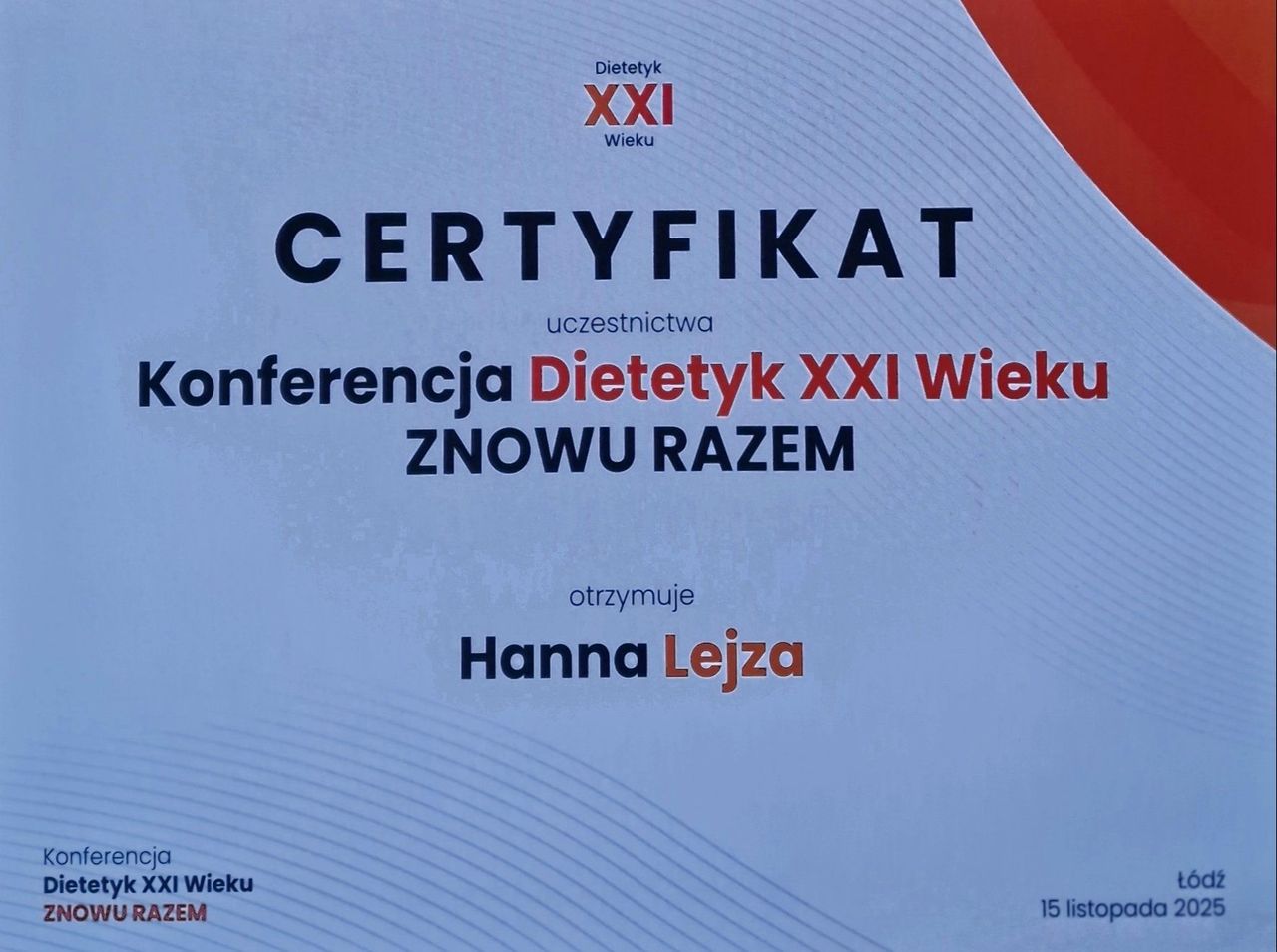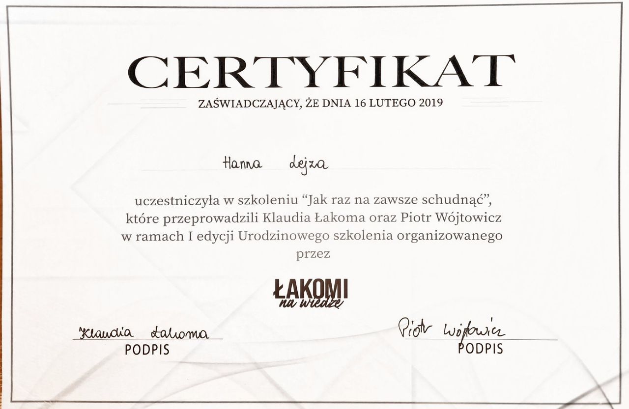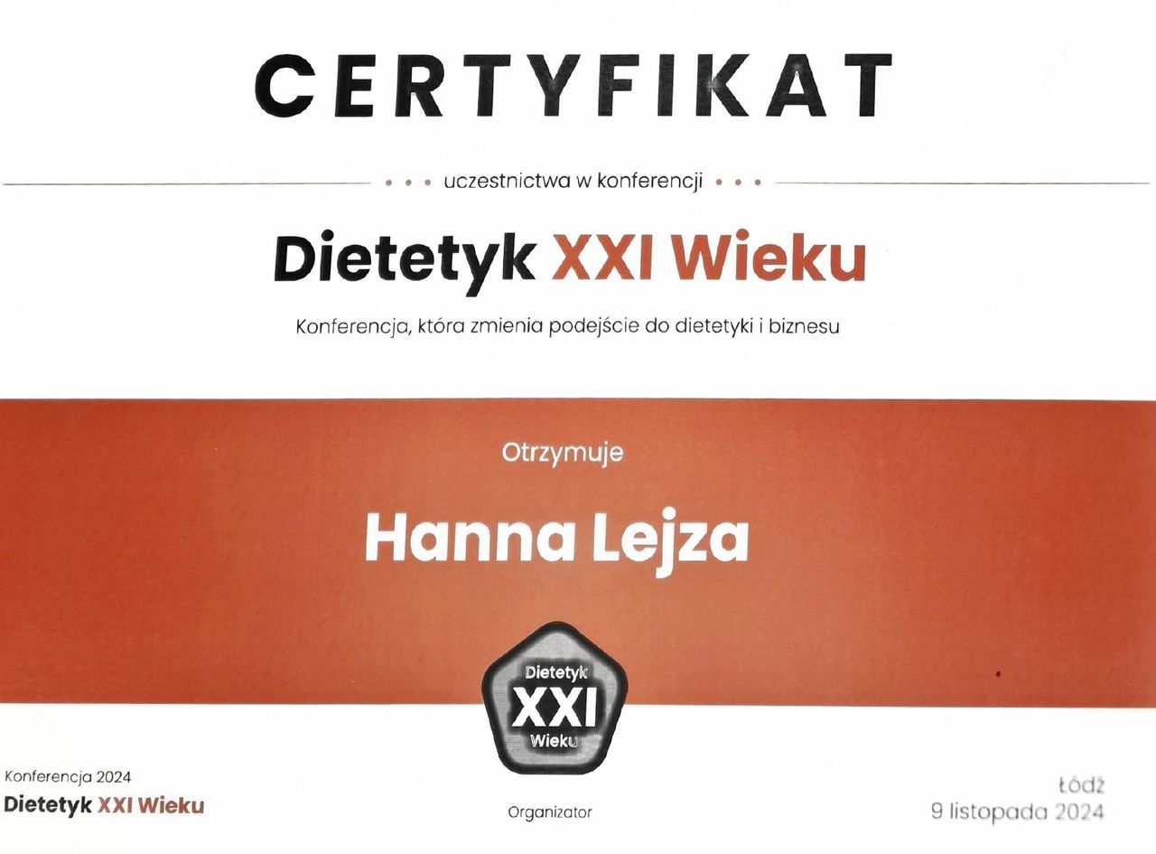 Jestem absolwentką studiów licencjackich i magisterskich na kierunku Żywienie człowieka i dietetyka na Uniwersytecie Przyrodniczym we Wrocławiu oraz studiów podyplomowych z zakresu psychodietetyki na Uniwersytecie SWPS we Wrocławiu. Swoje kompetencje nieustannie rozwijam, regularnie uczestnicząc w licznych szkoleniach, kursach i konferencjach branżowych, w tym m.in. w Konferencjach Dietetyk XXI Wieku oraz Konferencjach Współczesnej Dietetyki, co pozwala mi pracować zgodnie z aktualną wiedzą naukową i najnowszymi rekomendacjami.