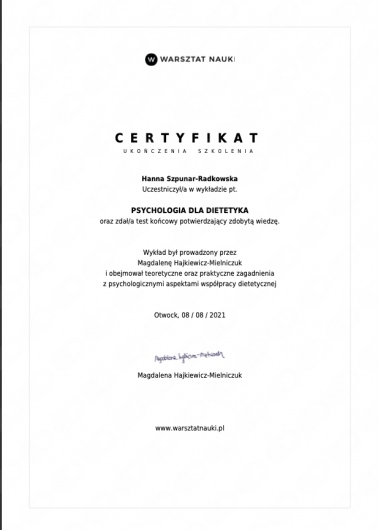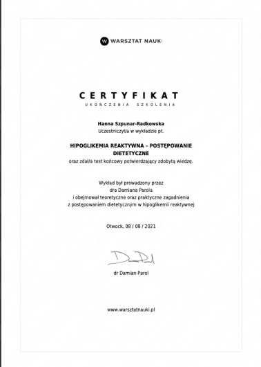 Pani Hanna wykazała się ogromną wiedzą, profesjonalizmem oraz rzetelnością, odpowiedziała na wszystkie pytania, podała wiele praktycznych rad. Wszystkie niezbędne dokumenty: plan suplementacji, dieta, materiały edukacyjne były omawiane szczegółowo oraz od razu przysłane po rozmowie. Po konsultacjach Pani Hanna szybko i sprawnie odpowiedziała na wszystkie moje pytania.