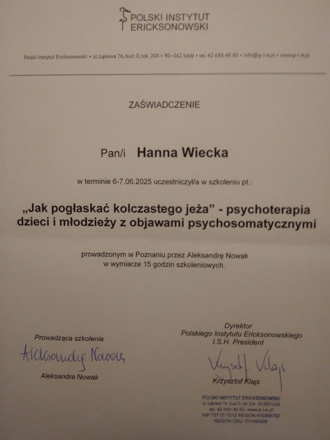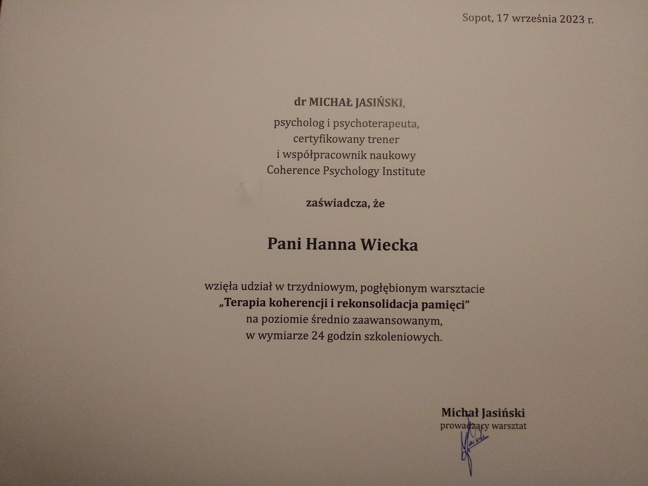 Pani Hanna to niezwykle ciepła i profesjonalna terapeutka, która potrafi stworzyć atmosferę zaufania i bezpieczeństwa. Jestem wdzięczna. za cały czas i wsparcie.”