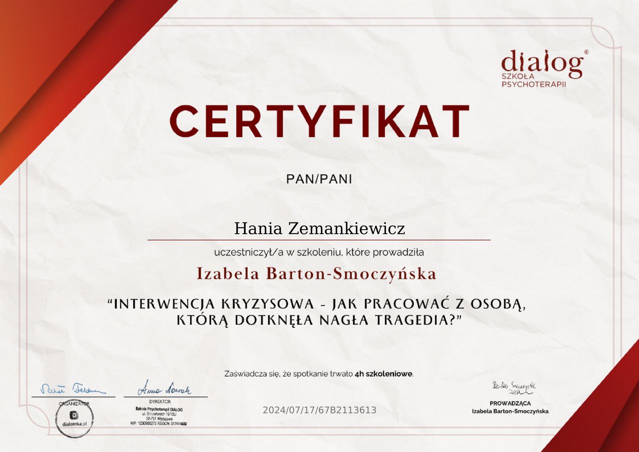 Jaki jest zakres porad oferowanych przez Hanna Zemankiewicz?Hanna Zemankiewicz to psycholog. Na podstawie swojego doświadczenia i wykształcenia Hanna Zemankiewicz oferuje usługi takie jak: Diagnoza osobowości MMPI, Diagnoza ADHD, Diagnoza psychoterapeutyczna, Konsultacja psychologiczna, konsultacja psychoterapeutyczna, opinia psychologiczna, Kurs zarządzania emocjami, psychoedukacja, Psychoterapia, psychoterapia depresji.