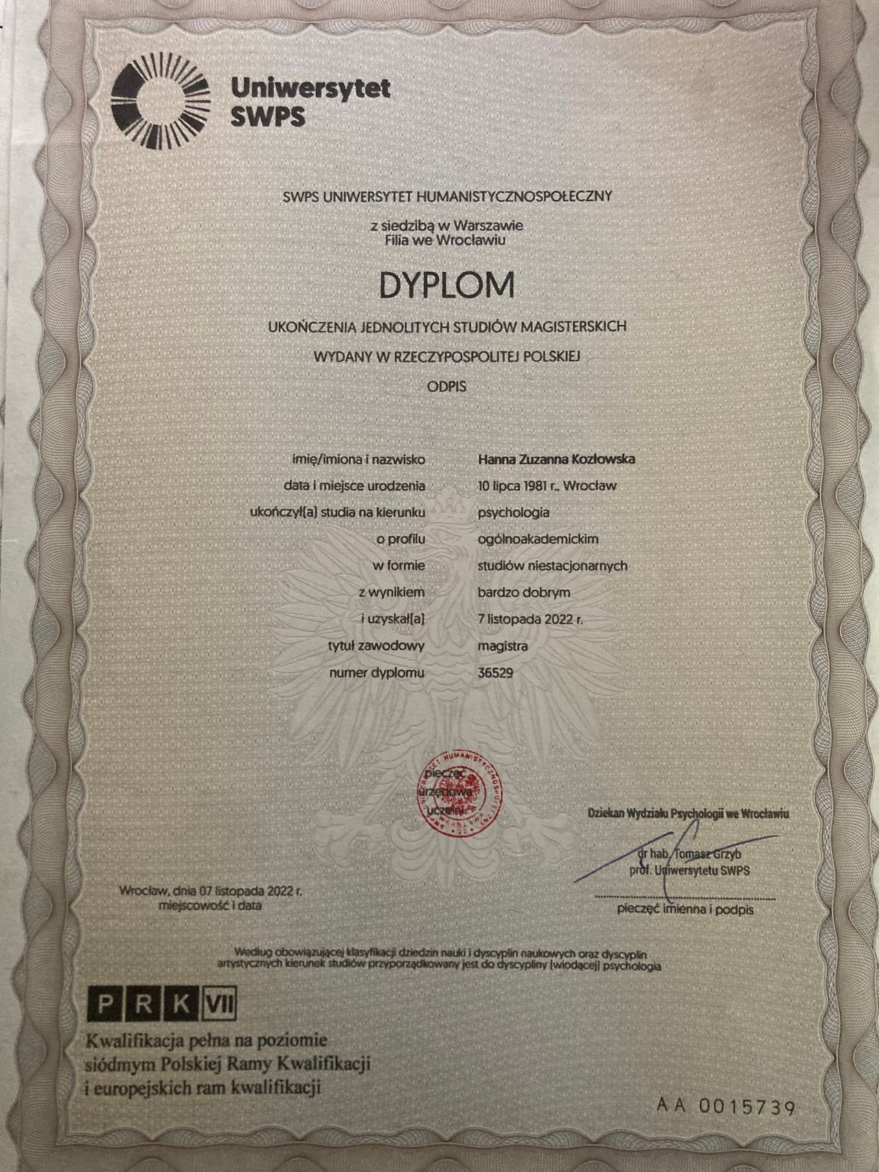 W centrum mojego zainteresowania jest klient i jego indywidualne potrzeby, do których dostosowuje metody pracy i narzędzia terapeutyczne o naukowo udowodnionej skuteczności. Zapraszam osoby zmagające się z lękiem (lęk uogólniony, napady paniki, OCD), obniżonym nastrojem (depresja), ADHD, żałobą, chorobą somatyczną, kryzysem w życiu zawodowym lub osobistym. Wspólnie przyjrzymy się problemom celem znalezienia optymalnych rozwiązań. Staram się podchodzić do problematyki danej osoby holistycznie, uwzględniając aspekty somatyczne, dietetyczne i środowiskowe. Chętnie pomogę Ci w poprawie relacji z innymi ludźmi, radzeniu sobie ze stresem i codziennością za pomocą pracy z emocjami, regulacji fizjologicznych reakcji na stan podwyższonego napięcia za pomocą ćwiczeń oddechowych i Mindfulness. Do problemów natury psychologicznej podchodzę kompleksowo, uwzględniając najnowszą, potwierdzoną naukowo wiedzę z różnych dziedzin. Jeśli odpowiada Ci nieformalna i serdeczna atmosfera pełna otwartości, zapraszam na konsultacje celem zdefiniowania problemu, możliwości pomocy i określenia Twoich mocnych stron, które ułatwią Ci dokonanie zmian w życiu. Pomoc psychologiczną świadczę również w języku angielskim, niemieckim i niderlandzkim. Jestem psychologiem i psychoterapeutą w trakcie czteroletniego, akredytowanego szkolenia w zakresie psychoterapii poznawczo-behawioralnej i dialogu motywującego przy Akademii Motywacji i Edukacji w Warszawie oraz studium psychoterapii Gestalt w Ośrodku Edukacji Psychologicznej we Wrocławiu. Jestem członkiem Polskiego Towarzystwa Terapii Poznawczo-Behawioralnej i poddaję swoją pracę regularnej superwizji. Ukończyłam psychologię o specjalności klinicznej na Uniwersytecie SWPS. Część studiów magisterskich odbyłam na wydziale psychologii Uniwersytetu Humboldta w Berlinie i Podyplomowej Szkole Berlin School of Mind and Brain w Niemczech, gdzie zdobywałam najnowszą, popartą dowodami wiedzę w dziedzinie neuronauki i psychologii. Ukończyłam Szkołę Interwencji Kryzysowej w Instytucie Terapii Poznawczo-Behawioralnej we Wrocławiu. Jestem również certyfikowanym praktykiem metody Brainspotting i EMDR, mających na celu pracę z traumą. Na co dzień pracuję jako psycholog na oddziale paliatywnym w Dolnośląskim Centrum Onkologii, Pulmonologii i Hematologii we Wrocławiu. Doświadczenie zawodowe zdobywałam również w Specjalistycznym Ośrodku Interwencji Kryzysowej przy Stowarzyszeniu Pomocy “Akson” we Wrocławiu, w Szpitalu im. A. Falkiewicza we Wrocławiu, Dolnośląskim Centrum Zdrowia Psychicznego i Centrum Terapii Alma we Wrocławiu. I also provide psychological assistance in English, German and Dutch. As a psychologist, I focus on the client and his individual needs, to which I adapt working methods and therapeutic tools of scientifically proven effectiveness. I specialize in helping people in relational, health and professional crises, who wish to make changes in their lives. I am happy to help you improve your relationships with other people, cope with stress and everyday life with the help of emotion work, regulate physiological reactions to a state of heightened tension with breathing exercises and Mindfulness. I approach psychological problems holistically, taking into account the latest scientifically validated knowledge from various fields. If you like the informal and cordial atmosphere full of openness, I invite you to a consultation to define the problem, the possibilities of assistance and to identify your strengths that will help you make changes in life.