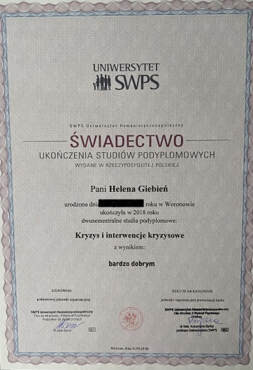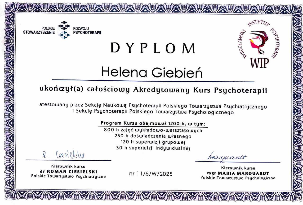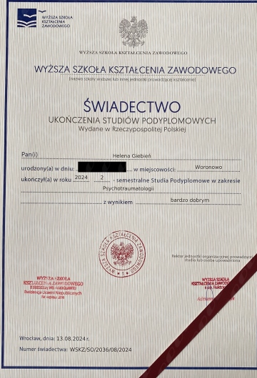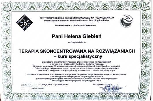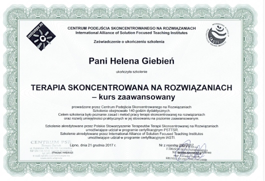 Ukończyłam 5-letni kurs w szkole psychoterapii we Wrocławskim Instytucie Psychoterapii akredytowanym przy Polskim Towarzystwie Psychiatrycznym i Polskim Towarzystwie Psychologicznym (w trakcie certyfikacji). Ciągle udoskonalam swoje umiejętności korzystając ze szkoleń specjalistycznych. Regularnie poddaje się superwizji.