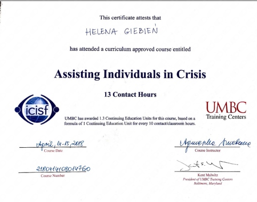 W pracy z drugą osobą wykorzystuje swoje umiejętności interpersonalne, wiedzę i doświadczenie. Swoją przygodę na tej drodze zawodowej zaczęłam jeszcze w latach 90. studiując pedagogikę na Uniwersytecie Wrocławskim i jednocześnie kończąc różne przydatne kursy w ramach zajęć i praktyki. Ukończyłam Szkołę Psychoterapii metodą „Gestalt”. Następnie szlifowałam umiejętności językowe na filologii słowiańskiej. Ukończyłam także podyplomowe studia na SWPS „Kryzys i interwencje kryzysowe” oraz "Psychotraumatologię" w WSKZ. Kolejne umiejętności nabywałam w Centrum Podejścia Skoncentrowanego na Rozwiązaniach, kończąc kurs podstawowy, zaawansowany i specjalistyczny.