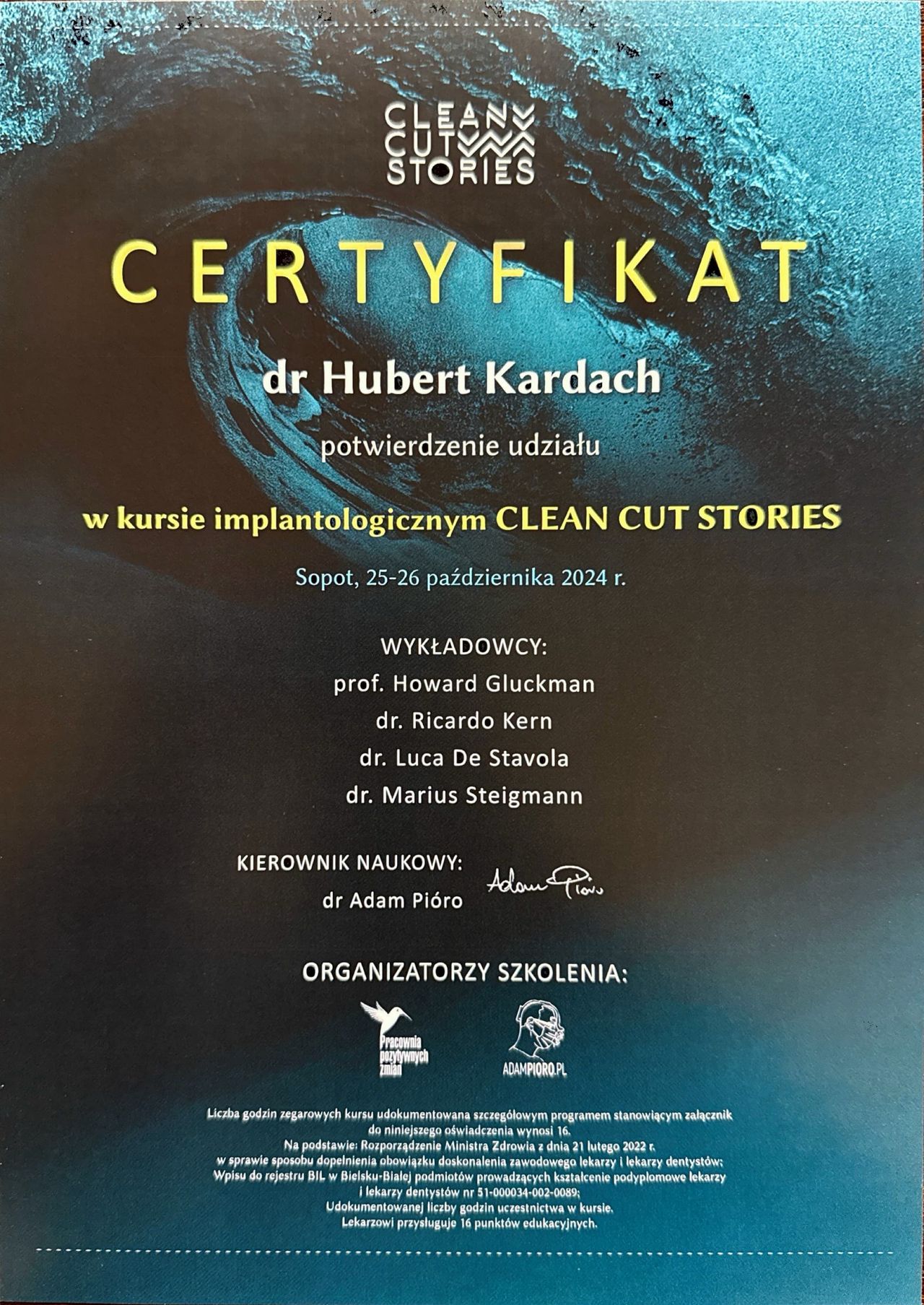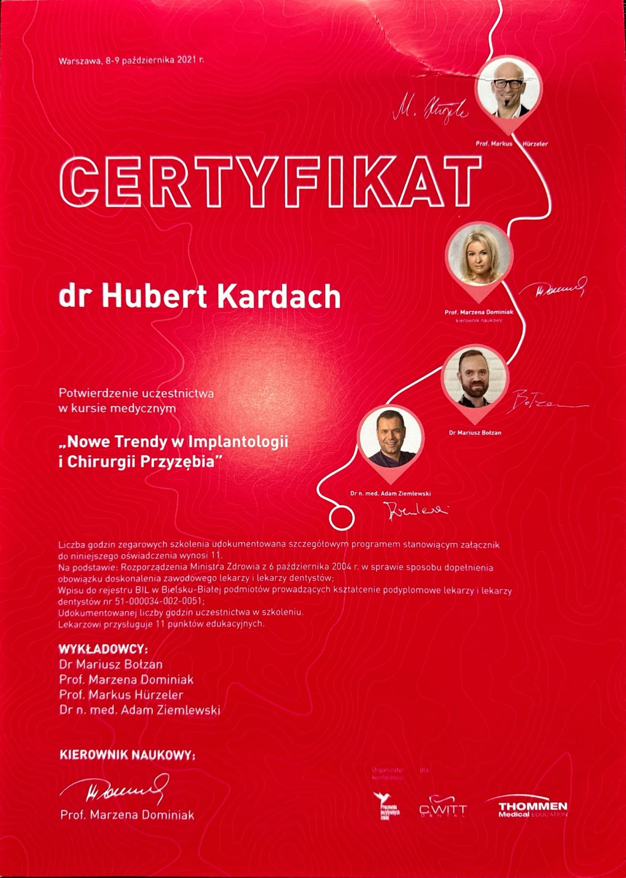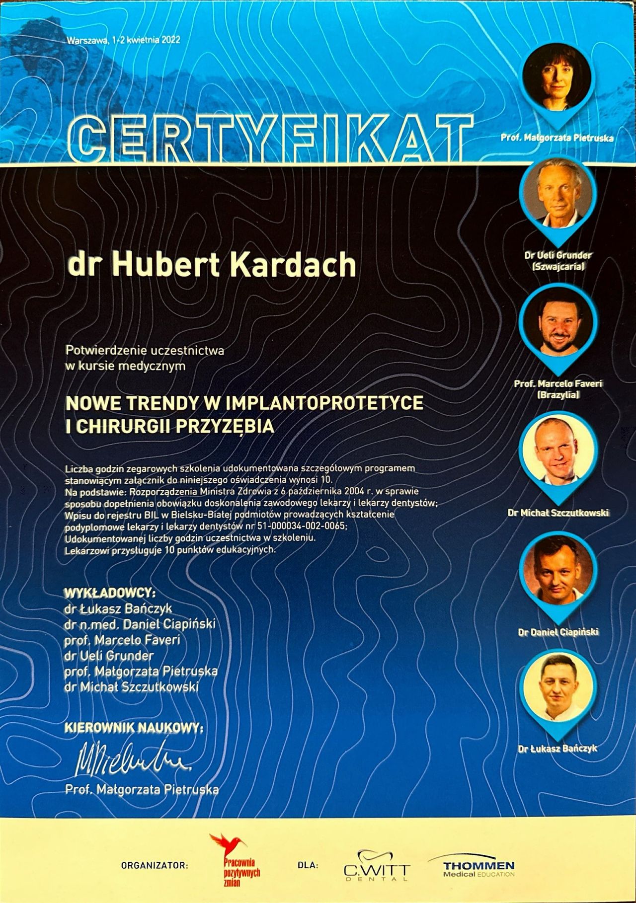 Jaki jest zakres porad oferowanych przez Hubert Kardach?Hubert Kardach to stomatolog. Na podstawie swojego doświadczenia i wykształcenia Hubert Kardach oferuje usługi takie jak: konsultacja implantologiczna.