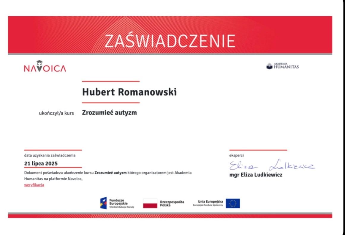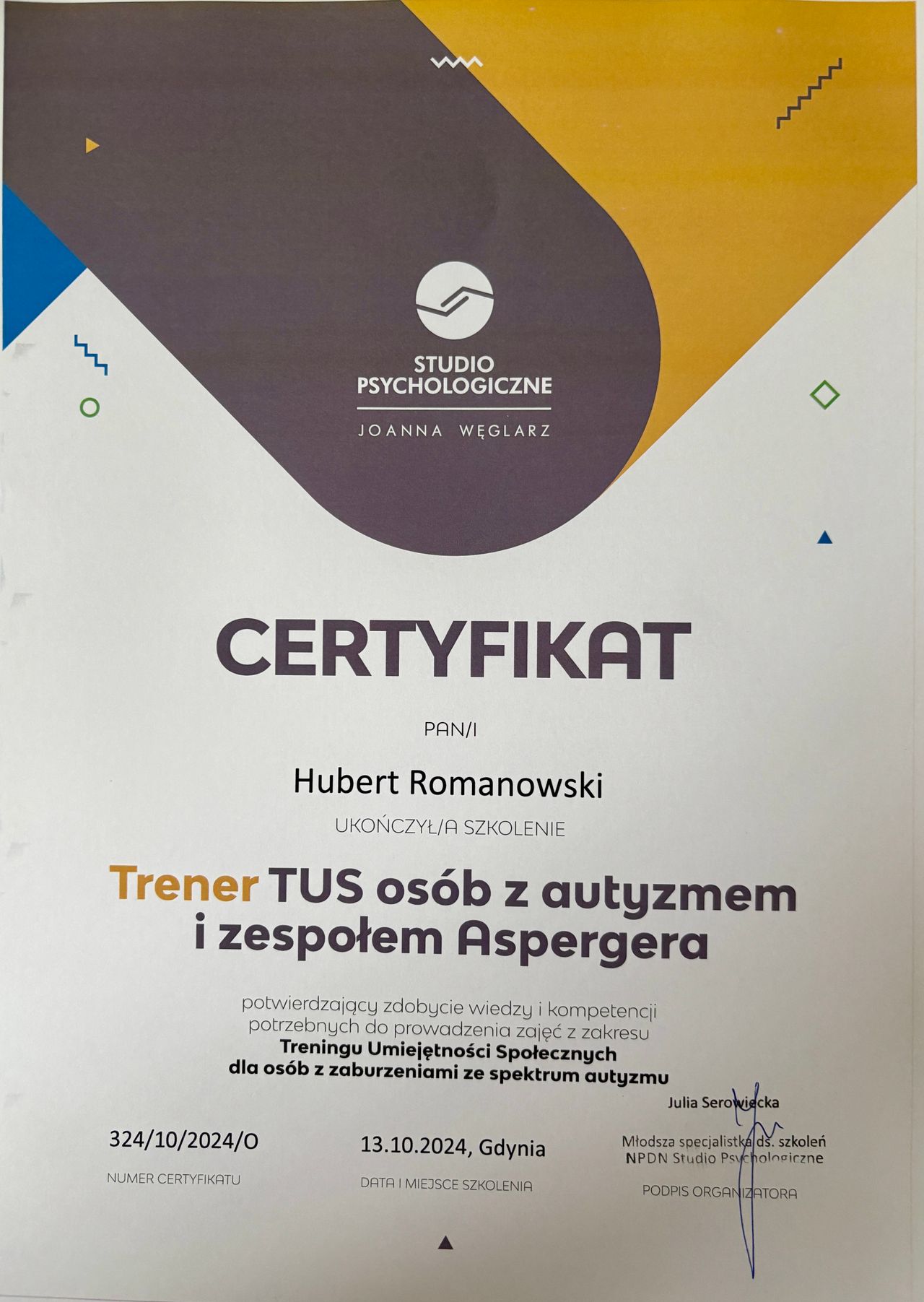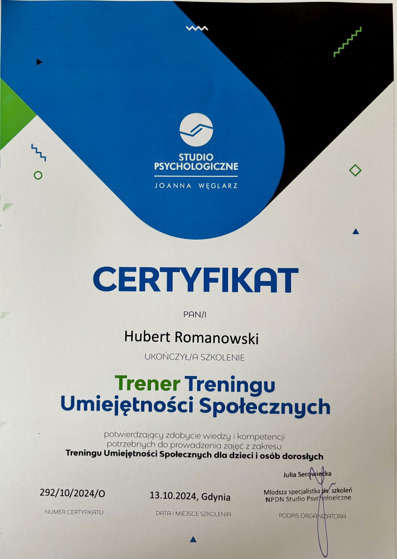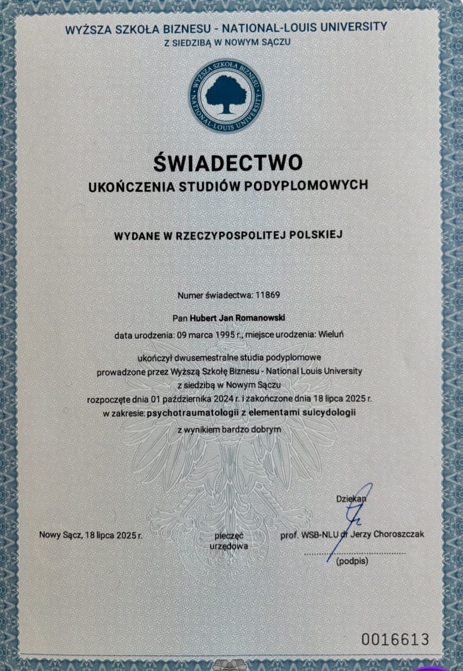 Jestem psychologiem, absolwentem studiów magisterskich z psychologii oraz studiów podyplomowych z zakresu psychotraumatologii. Obecnie jestem w trakcie studiów podyplomowych z przygotowania pedagogicznego dla psychologów, które poszerzają moje rozumienie procesów rozwojowych dzieci i młodzieży. Posiadam certyfikaty trenera Treningu Umiejętności Społecznych (TUS I i II stopnia), co pozwala mi skutecznie wspierać rozwój kompetencji społecznych i emocjonalnych.