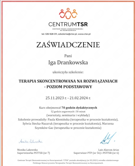 Posiadam doświadczenie w pracy zarówno z dorosłymi, jak i z dziećmi i młodzieżą. Nieustannie wzbogacam swoją wiedzę, biorąc udział w szkoleniach i warsztatach z zakresu psychoterapii.