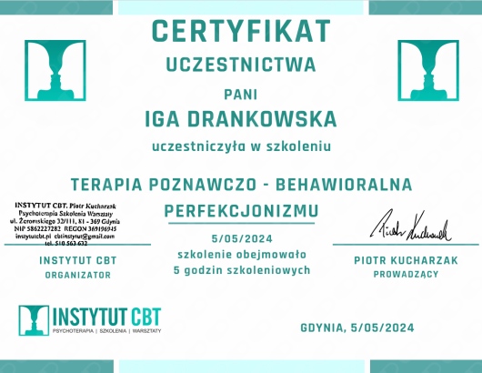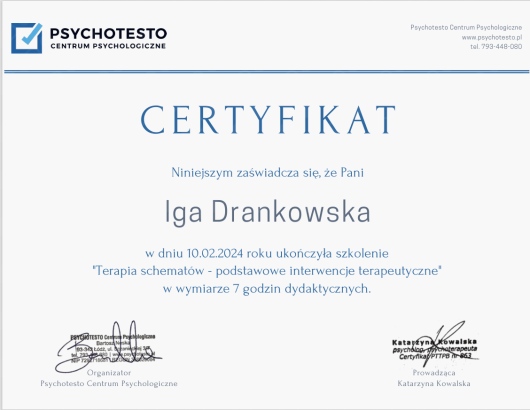 Czy Iga Drankowska przyjmuje online, bez konieczności pojawiania się w placówce?Tak, Iga Drankowska oferuje konsultacje online. Wybierz opcję „konsultacja online” przy umawianiu wizyty, a zobaczysz dostępne terminy.